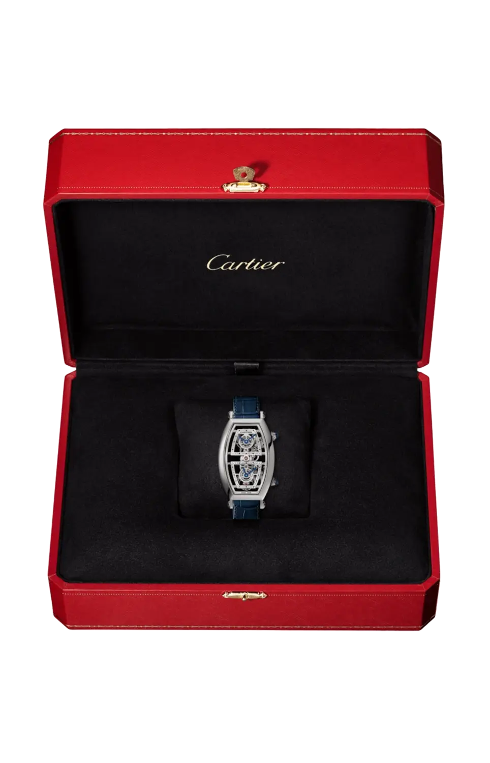 Бренд: Cartier Очень большая модель скелетонизированных часов Tonneau, мануфактурный механизм с ручным заводом, калибр 9919 MC. Корпус из платины 950/1000, две жемчужные заводные головки, каждая из которых украшена синим сапфиром-кабошоном, стрелки в форме мечей из вороненой стали, сапфировое стекло и задняя крышка, синий ремешок из кожи аллигатора, раскладывающаяся застежка из белого золота 750/1000. Усложнение с двумя часовыми поясами: два отдельных индикатора часов и минут, мосты, образующие скелетонированные циферблаты. Механизм с индивидуальной нумерацией, 197 деталей и 35 камней. Размеры 37,8 х 24 мм, толщина 7,9 мм, баланс 28 800 полуколебаний/час, запас хода около 60 часов. Размеры корпуса 52,4 х 29,8 мм, толщина 10,4 мм. Водонепроницаемость до 30 метров.