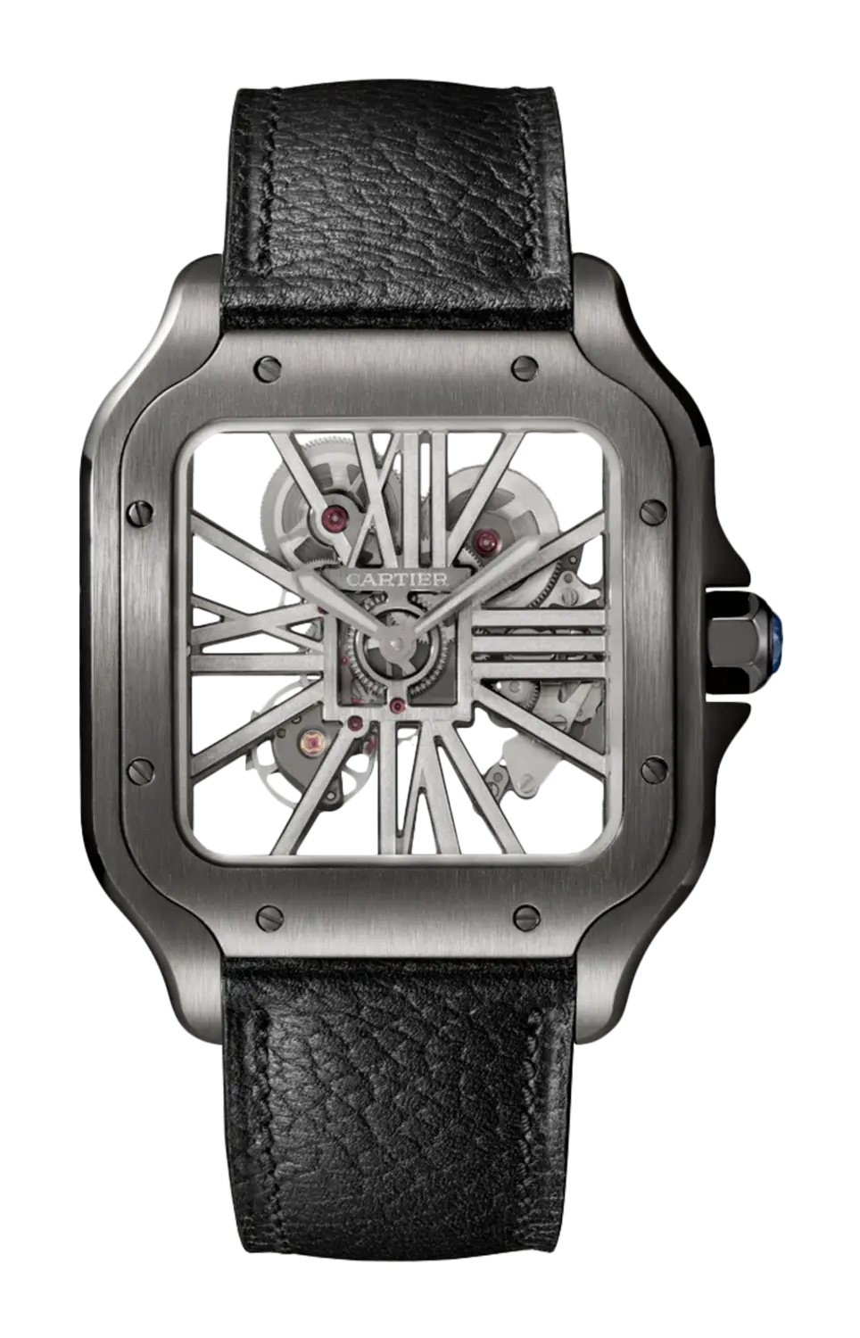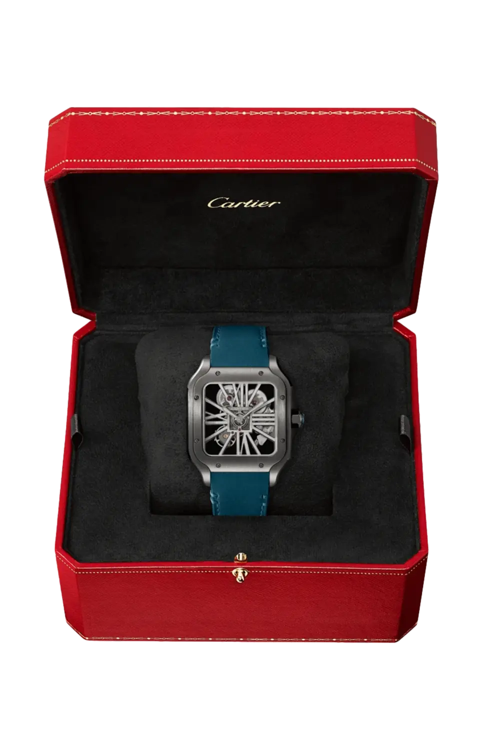 Бренд: Cartier Часы-скелетон Santos, крупная модель, мануфактурный механизм с ручным заводом, калибр 9612 MC. Стальной корпус с черным ADLC-покрытием, семиугольная заводная головка, украшенная синей синтетической шпинелью, стрелки в форме мечей из серой полированной стали, сапфировое стекло и задняя крышка. Синий ремешок из телячьей кожи, стальная раскладывающаяся застежка с двойной регулировкой и черным ADLC-покрытием. Второй ремешок из черной телячьей кожи. Оба ремешка оснащены системой смены Quickswitch. Часы, минуты со скелетонизированными мостами в форме римских цифр и люминесцентным материалом. Механизм с индивидуальной нумерацией, 138 деталей и 20 камней. Размеры 28 х 28 мм, толщина 3,97 мм, баланс 28 800 полуколебаний/час, запас хода около 72 часов. Ширина корпуса 39,7 мм, толщина 9,08 мм. Водонепроницаемость до 100 метров.