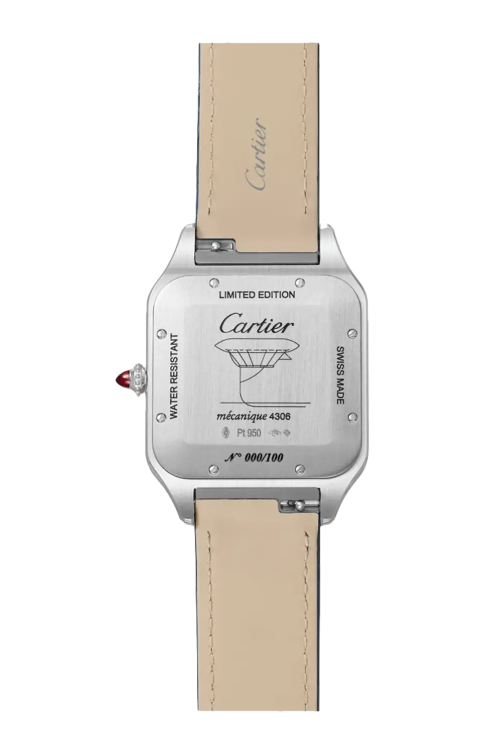 Бренд: Cartier Часы Santos-Dumont, ограниченная и пронумерованная серия из 100 экземпляров. Модель очень большого размера, мануфактурный механизм с ручным заводом, калибр 430 микрон. Корпус из платины 950/1000, жемчужная заводная головка с рубином-кабошоном, синий циферблат, арабские цифры, стрелки в форме мечей из вороненой стали, сапфировое стекло. Синий ремешок из кожи аллигатора, застежка из платины 950/1000 пробы. Задняя крышка украшена гравировкой с изображением летательного аппарата Альберто Сантос-Дюмона: «Guide-Rope Maritime». Размеры корпуса 46,6 х 33,9 мм, толщина 7,5 мм. Водонепроницаемость до 30 метров. Запонки Santos de Cartier из белого золота 750/1000 пробы с родиевым покрытием и соколиным глазом. Размер головки 15 х 15 х 2,9 мм. Коробка из лакированного дерева, отделка и детали из палладия, внутренняя часть из серой алькантары*, ограниченная и пронумерованная серия из 100 экземпляров. Размеры 131 х 131 х 105 мм. *Alcantara — зарегистрированная торговая марка, не принадлежащая Cartier.