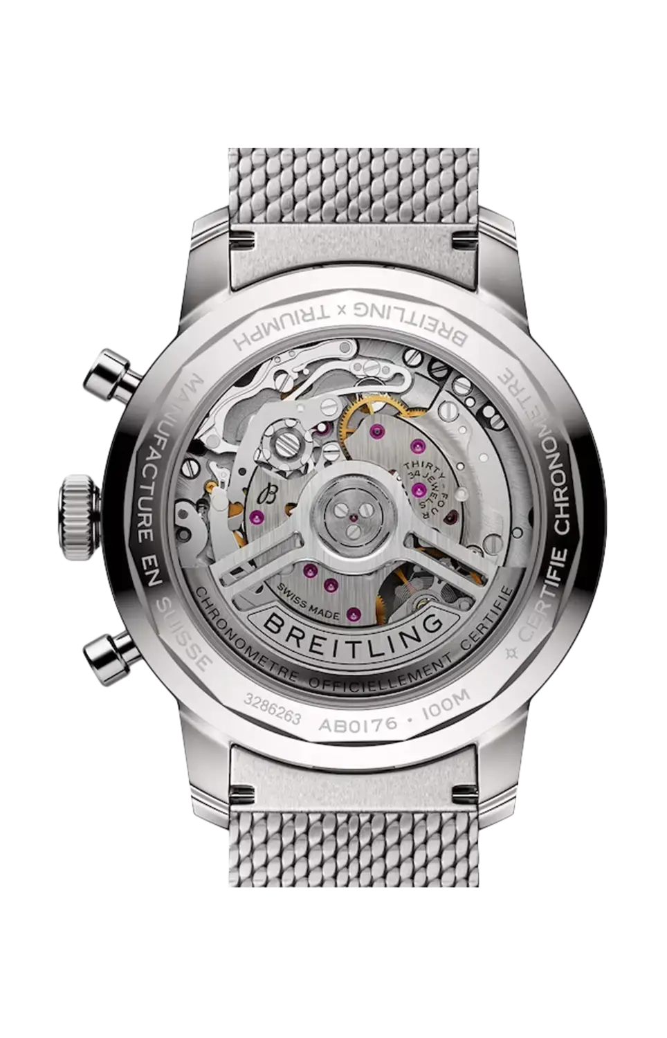 Бренд: Breitling 60-е годы были десятилетием экспериментов, веселья, свободы и энергии. Лозунгом тех дней было жить на максимальной скорости: ездить на мотоцикле в длительные поездки или на борту спортивного автомобиля. Вилли Брейтлинг почувствовал это изменение темпа и решил разработать нетрадиционный хронограф, который бы отражал воодушевление того периода. И он назвал это лучшим временем. Эта наполненная духом традиция продолжается и сегодня: Breitling сотрудничает с некоторыми из самых знаковых мировых брендов автоспорта для создания первоклассных моделей. Эти часы созданы в результате сотрудничества с историческим британским производителем мотоциклов Triumph и имеют характерный ледяной синий циферблат. Своеобразный цвет в точности напоминает синий цвет Triumph Thunderbird 6T 1951 года и редкой модели Breitling Top Time, арт. 815 70-х годов с синим циферблатом. Коллекционеры наверняка заметят некоторые другие отсылки к винтажным моделям Breitling, такие как ретро-логотип, грибовидные кнопки хронографа и дизайн циферблата «Зорро». Мотив галстука-бабочки, впервые появившийся в 1960-х годах (и получивший прозвище в честь маски хитрого фехтовальщика), был тонко интегрирован с отделкой из матового металла, создающей сияющую игру света и текстур. Дизайн характеризуется триумфальной эмблемой в положении «6 часов», тахиметрической шкалой для измерения скорости и контрастными «квадратными» счетчиками (не совсем квадратными и не совсем круглыми), напоминающими старинные тахометры на приборной панели. Под капотом у этой модели также есть новый двигатель: потрясающий калибр 01, изготовленный Breitling.