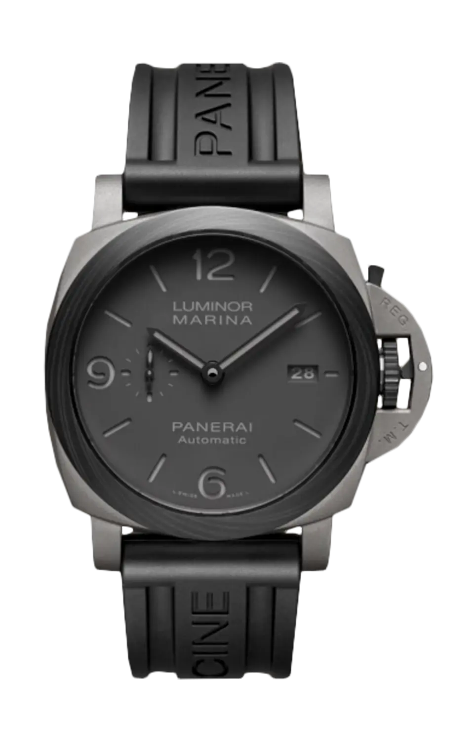 Автоматический календарь Luminor темно-синего цвета диаметром 44 мм. Двойной ремешок: черный ПВХ Sportech и черный каучук.
