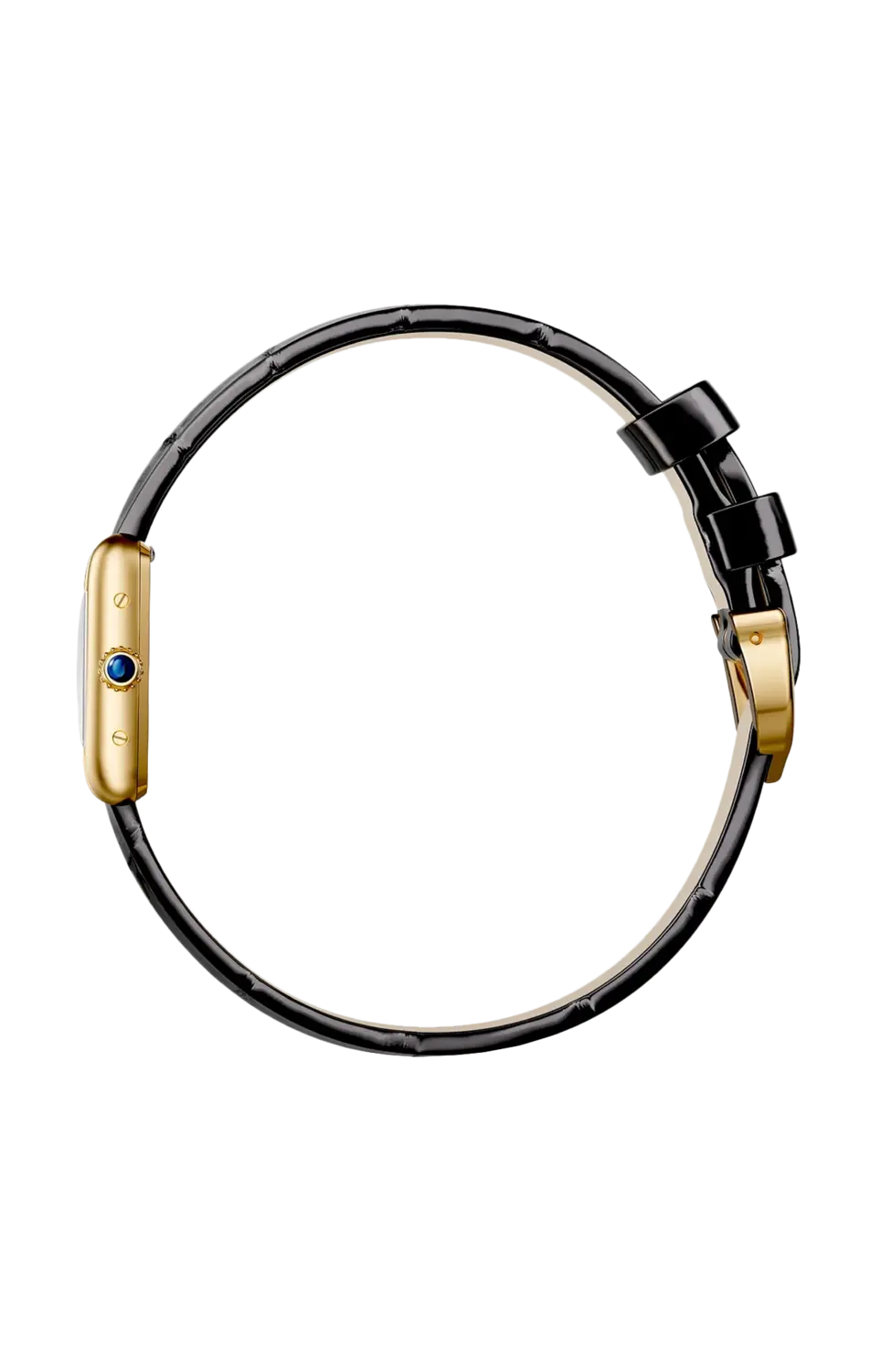 Часы Tank Louis Cartier, мини-модель, кварцевый механизм. Корпус из желтого золота 750/1000 пробы, заводная головка из жемчуга и сапфира, посеребренный зернистый циферблат, стрелки в форме мечей из вороненой стали, минеральное стекло, блестящий черный ремешок из кожи аллигатора, застежка из желтого золота 750/1000 пробы. Размеры корпуса 24х16,5мм, толщина 6,2мм. Водонепроницаемость до 30 метров.