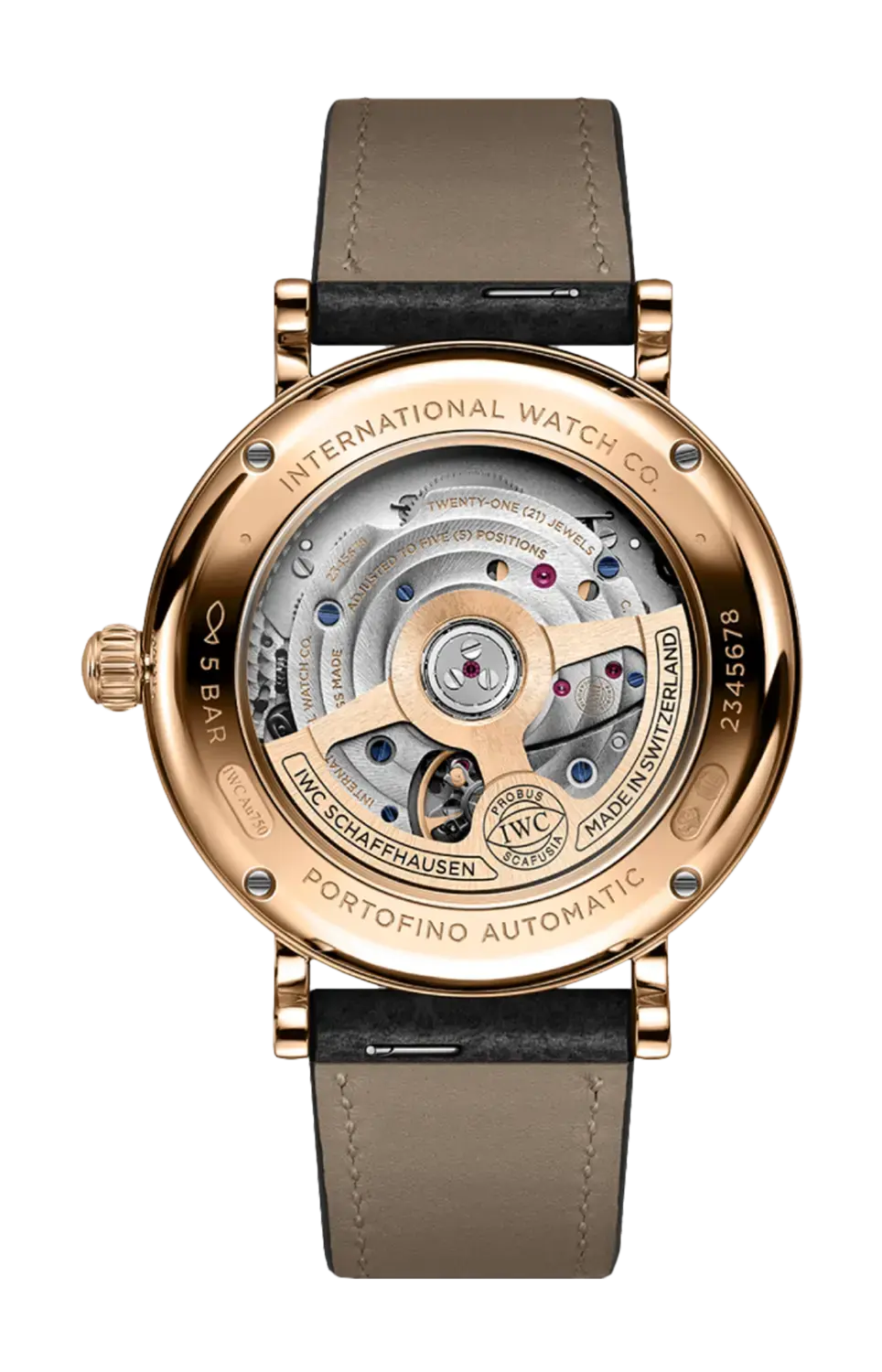 Модель Portofino Automatic 37 оснащена калибром 32111 производства IWC и прозрачной задней крышкой из сапфирового стекла, на которой виден механизм.