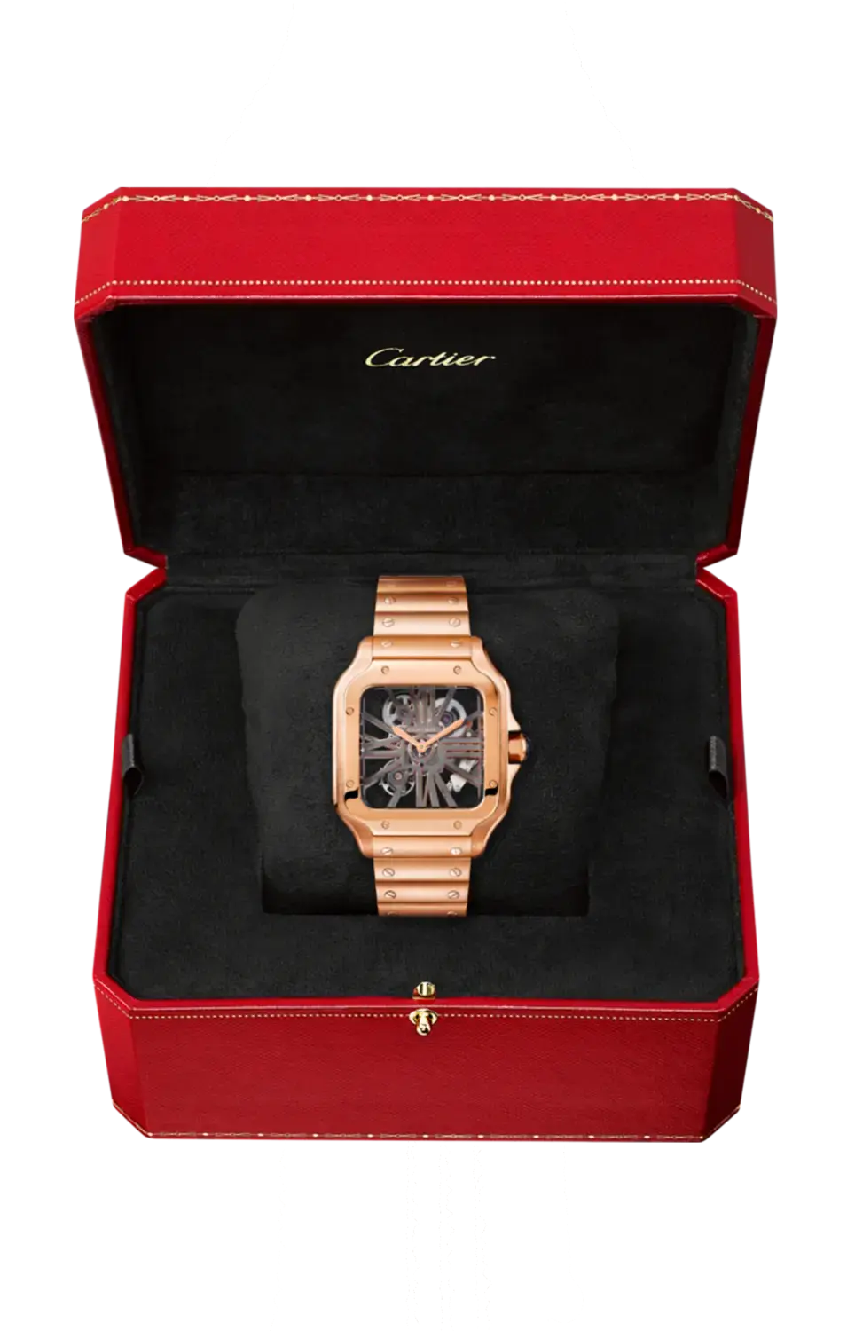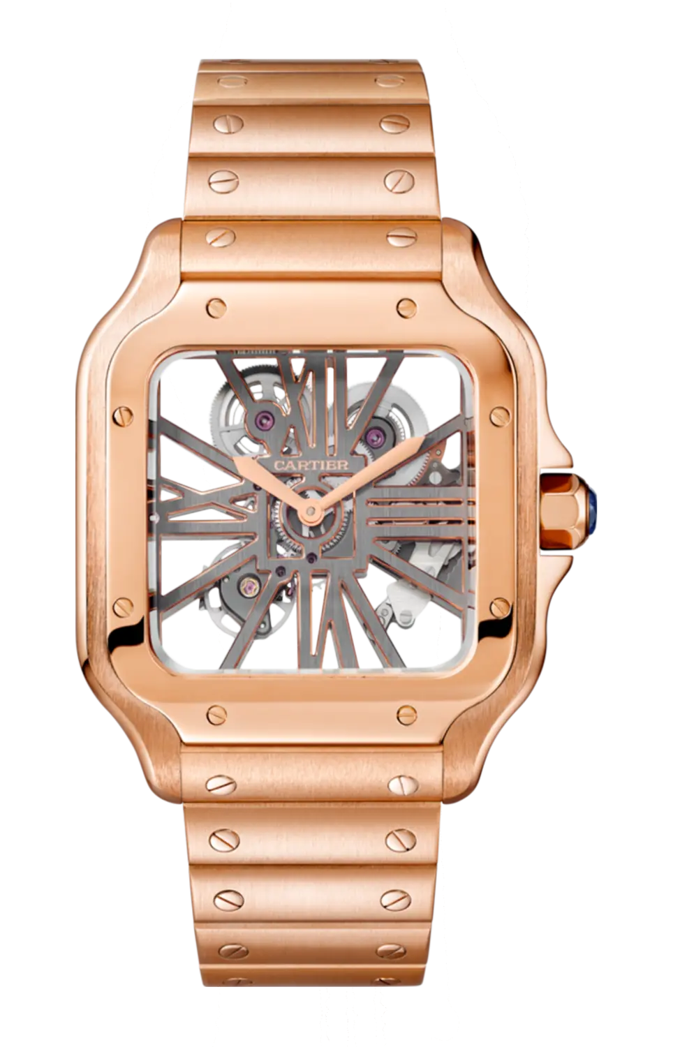 Бренд: Cartier Часы-скелетон Santos, крупная модель, мануфактурный механизм с ручным заводом, калибр 9619 MC. Корпус из розового золота 18 карат, семиугольная заводная головка из розового золота 18 карат с граненым сапфиром, золотые стрелки в форме мечей, сапфировое стекло и задняя крышка. Браслет из 18-каратного розового золота с системой регулировки размера Smartlink. Второй ремешок из кожи аллигатора, сменная раскладывающаяся застежка из розового золота 18 карат. Оба оснащены системой быстрой замены. Часы, минуты со скелетонизированными мостами в форме римских цифр. Механизм с индивидуальной нумерацией, 138 деталей и 20 камней. Размеры 28 х 28 мм, толщина 3,97 мм, баланс 28 800 полуколебаний/час, запас хода около 72 часов. Ширина корпуса 39,8 мм, толщина 9,08 мм. Водонепроницаемость до 100 метров.