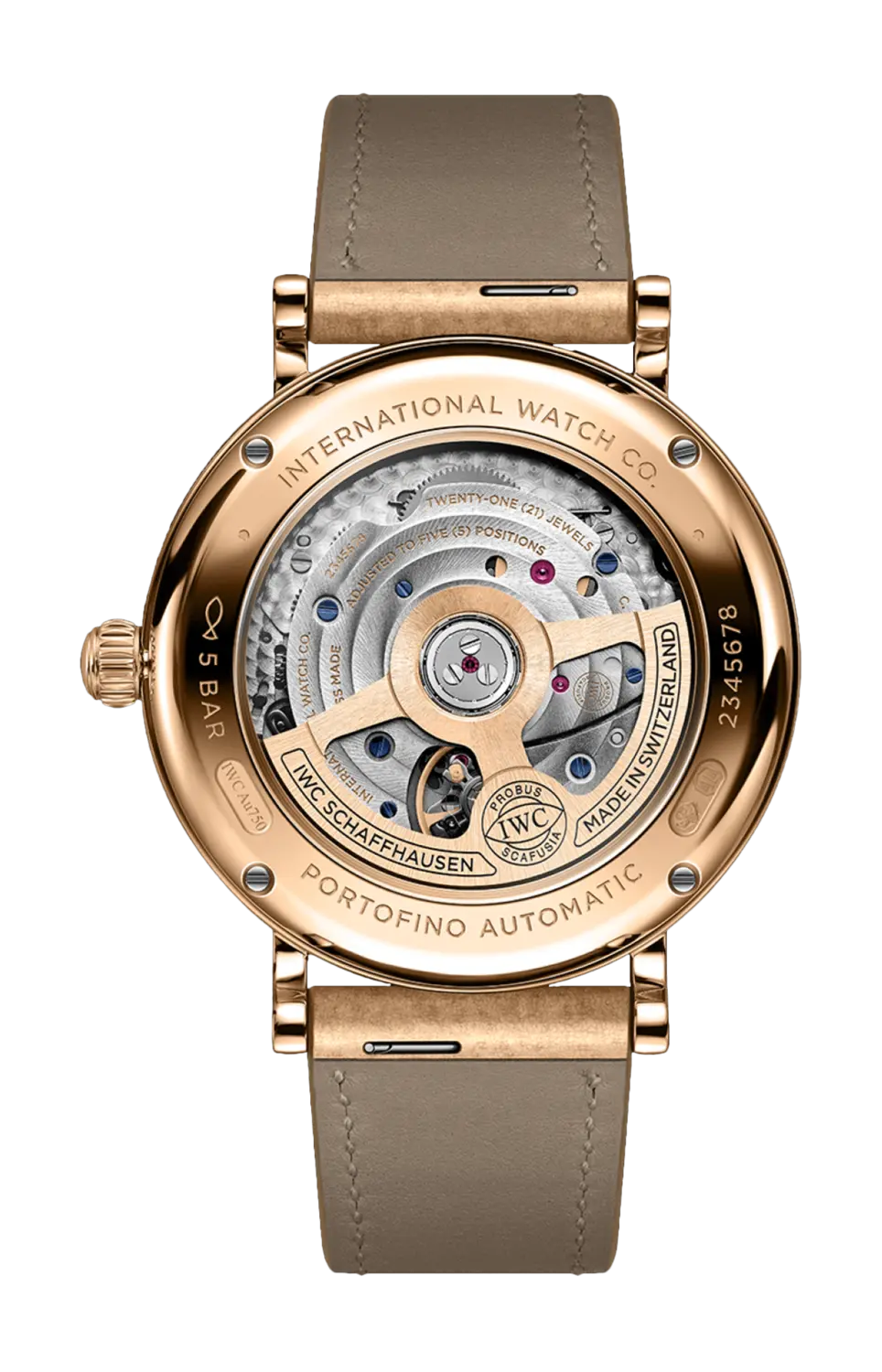 Модель Portofino Automatic 37 оснащена калибром 32111 производства IWC и прозрачной задней крышкой из сапфирового стекла, на которой виден механизм.