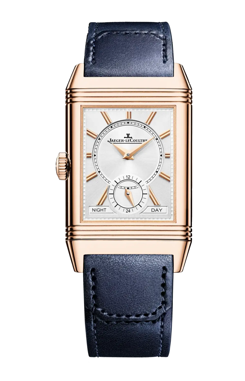 Бренд: Jaeger-Lecoultre Модель Duoface Tribute Reverso в корпусе из розового золота — это возвращение к первым моделям 1931 года с их символическими кодами: минутная шкала «chemin defer», накладные индексы, стрелки «дофин»… На лицевой стороне расположен темно-синий лакированный циферблат с солнечные лучи, результат сложного процесса лакирования, включающего 50 этапов производства и нанесение 20 слоев лака. На задней стороне серебряный циферблат с отделкой в виде солнечных лучей подчеркивает каждую деталь часов, оснащенных мануфактурным калибром 854, который отображает второй часовой пояс. В сочетании с системой сменных ремешков – синим ремешком из телячьей кожи и ремешком из двух материалов того же цвета – часы предлагают своему владельцу свободу менять стиль в мгновение ока.