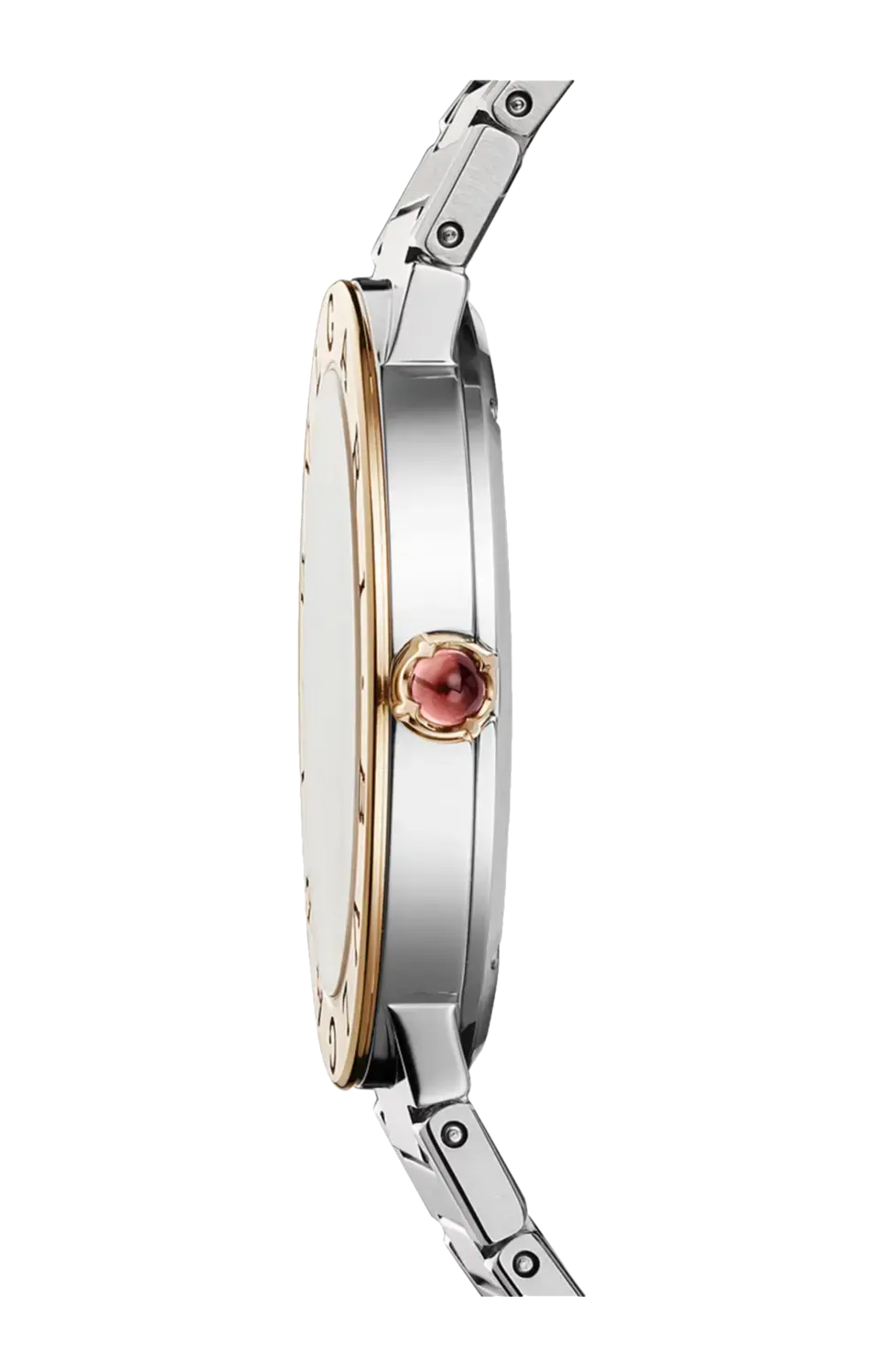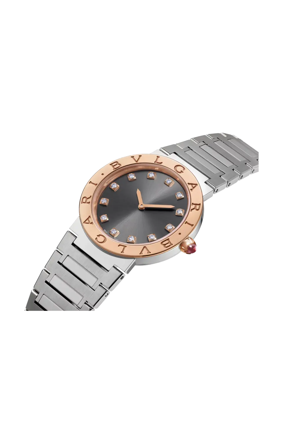 Часы Bvlgari Часы Bvlgari, корпус и браслет из полированной и сатинированной нержавеющей стали, безель из 18-каратного розового золота с двойным логотипом, антрацитовый лаковый циферблат и индексы, украшенные 12 бриллиантами. Водонепроницаемость до 30 метров.