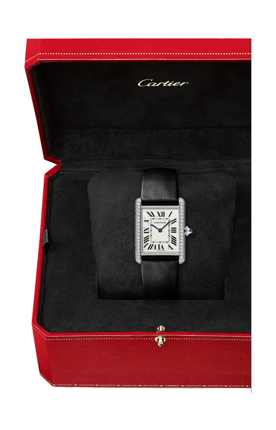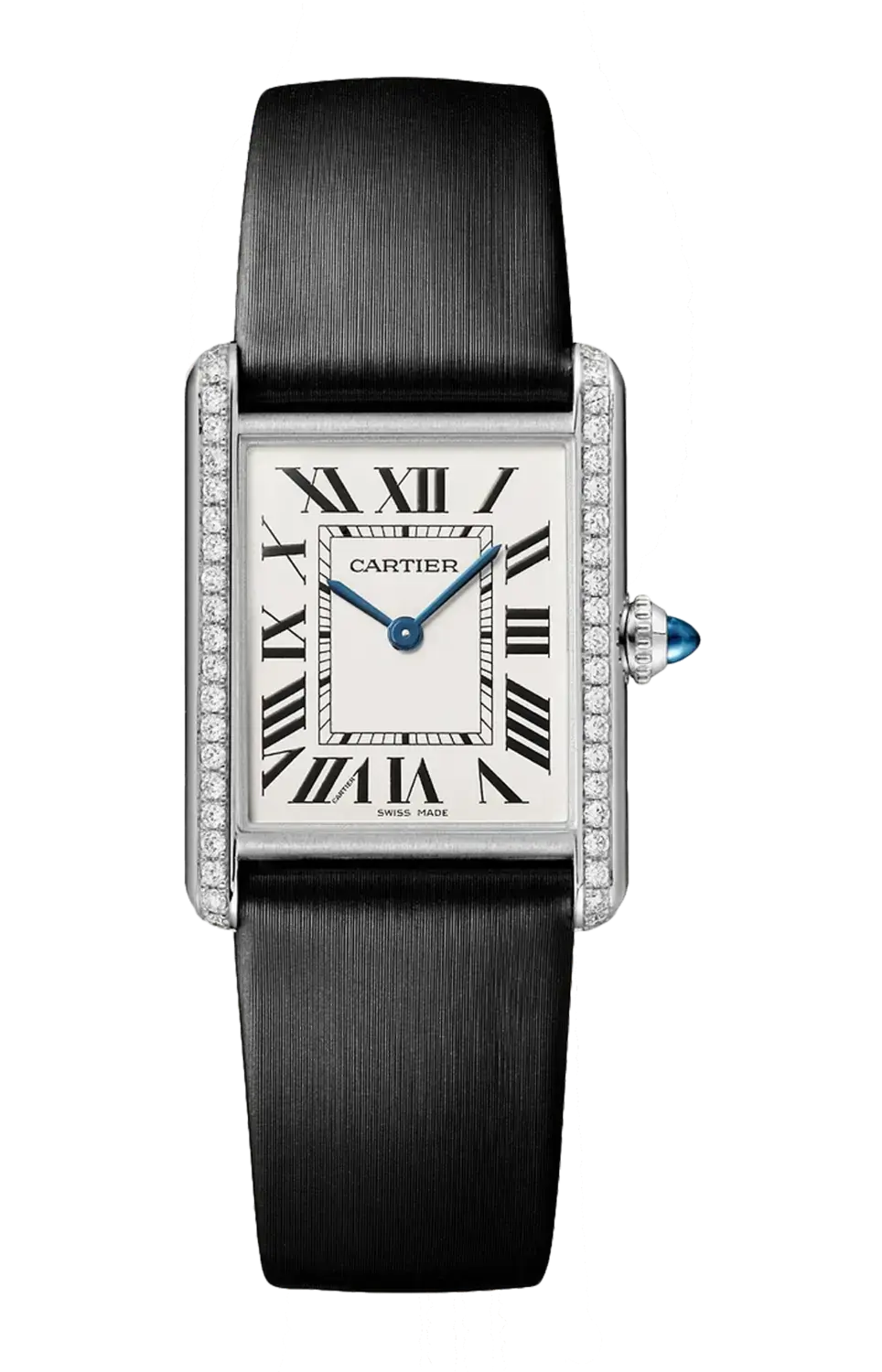 Часы Must Tank, крупная модель, кварцевый механизм. Стальной корпус, безель с 42 бриллиантами классической огранки (0,48 карата), перламутровая заводная головка с кабошоном из синтетической шпинели, посеребренный циферблат, стрелки в форме мечей из вороненой стали, черный ремешок из матовой телячьей кожи, стальная застежка. Размеры корпуса 33,7 х 25,5 мм, толщина 6,6 мм. Водонепроницаемость до 30 метров.
