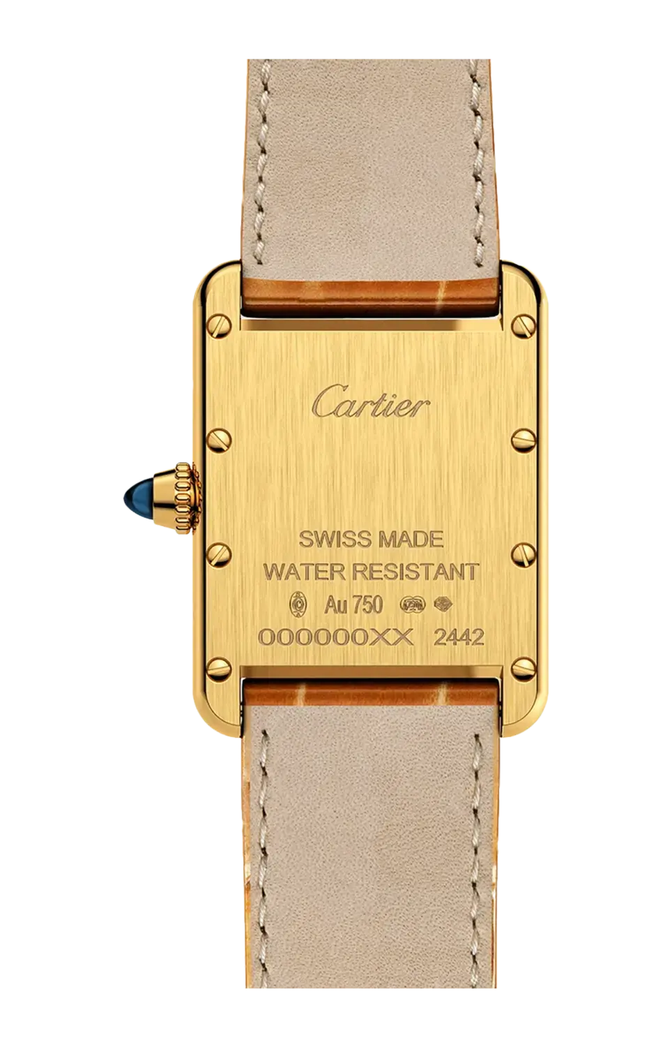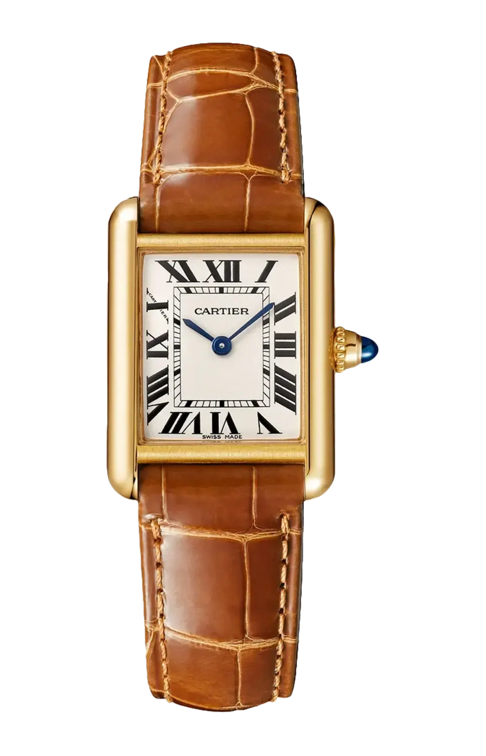 Часы Tank Louis Cartier, маленькая модель, кварцевый механизм. Корпус из желтого золота 750/1000 пробы, жемчужная заводная головка с сапфиром-кабошоном, посеребренный зернистый циферблат, стрелки в форме мечей из вороненой стали, минеральное стекло, ремешок из кожи аллигатора, застежка из желтого золота 750/1000 пробы. Размеры корпуса 29,5 х 22 мм, толщина 6,35 мм. Водонепроницаемость до 30 метров.