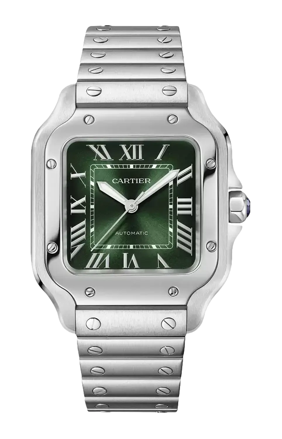 Часы Santos de Cartier, средняя модель. Стальной корпус, семигранная заводная головка, украшенная граненой синей синтетической шпинелью, градуированный зеленый циферблат, полированные стальные стрелки в форме мечей с люминесцентным материалом, сапфировое стекло. Стальной браслет с системой регулировки «smartlink». Зеленый ремешок из кожи аллигатора, сменная стальная раскладывающаяся застежка.