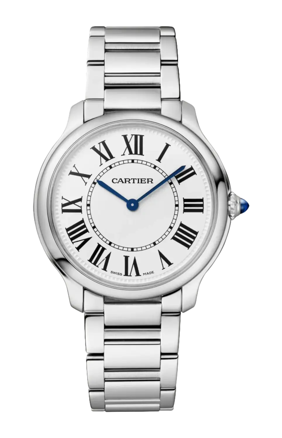 Часы Ronde must de Cartier, 36 мм, кварцевый механизм с высокой автономностью (~8 лет). Стальной корпус, перламутровая заводная головка, украшенная кабошоном из синтетической шпинели, серебряный циферблат с пескоструйной обработкой, стрелки в форме мечей из вороненой стали, сапфировое стекло, стальной браслет, оснащенный системой взаимозаменяемости. Толщина 7,89 мм. Водонепроницаемость до 30 метров.