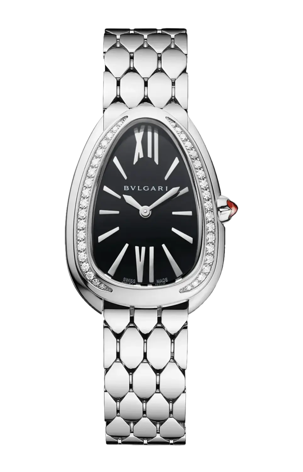 Бренд: Bulgari Благодаря изысканному великолепию материалов часы Serpent Seducers из нержавеющей стали делают время еще более ценным. Возвращаясь к иконе соблазнения Bulgari благодаря необычному новому дизайну, часы сочетают в себе символический корпус в форме головы змеи и черный лакированный циферблат, окруженный бриллиантами. Мягкий браслет часов, украшенный драгоценными шестиугольными шкалами, воплощает гламур ювелирного искусства и исключительную эстетику. Соблазнительные часы в форме змеи с кварцевым механизмом, корпус из нержавеющей стали диаметром 33 мм, безель из нержавеющей стали с 38 бриллиантами круглой огранки, заводная головка из нержавеющей стали с кабошоном. ограненный розовый рубеллит, черный лакированный циферблат, браслет с раскладывающейся застежкой из нержавеющей стали. Водонепроницаемость до 30 метров.