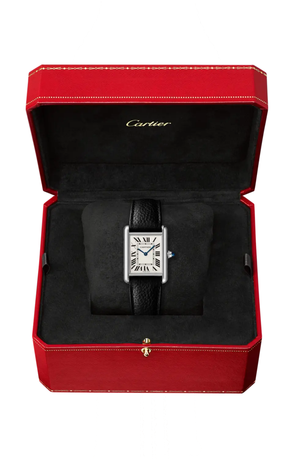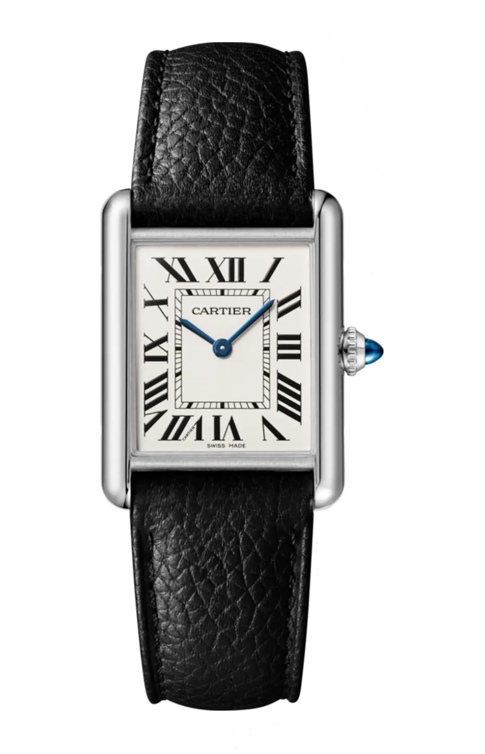 Часы Must Tank, крупная модель, кварцевый механизм. Стальной корпус, перламутровая заводная головка, украшенная кабошоном из синтетической шпинели, посеребренный циферблат, стрелки в форме мечей из вороненой стали, сапфировое стекло, черный зерненый ремешок из телячьей кожи, стальная застежка. Размеры корпуса 33,7 х 25,5 мм, толщина 6,6 мм. Водонепроницаемость до 30 метров.
