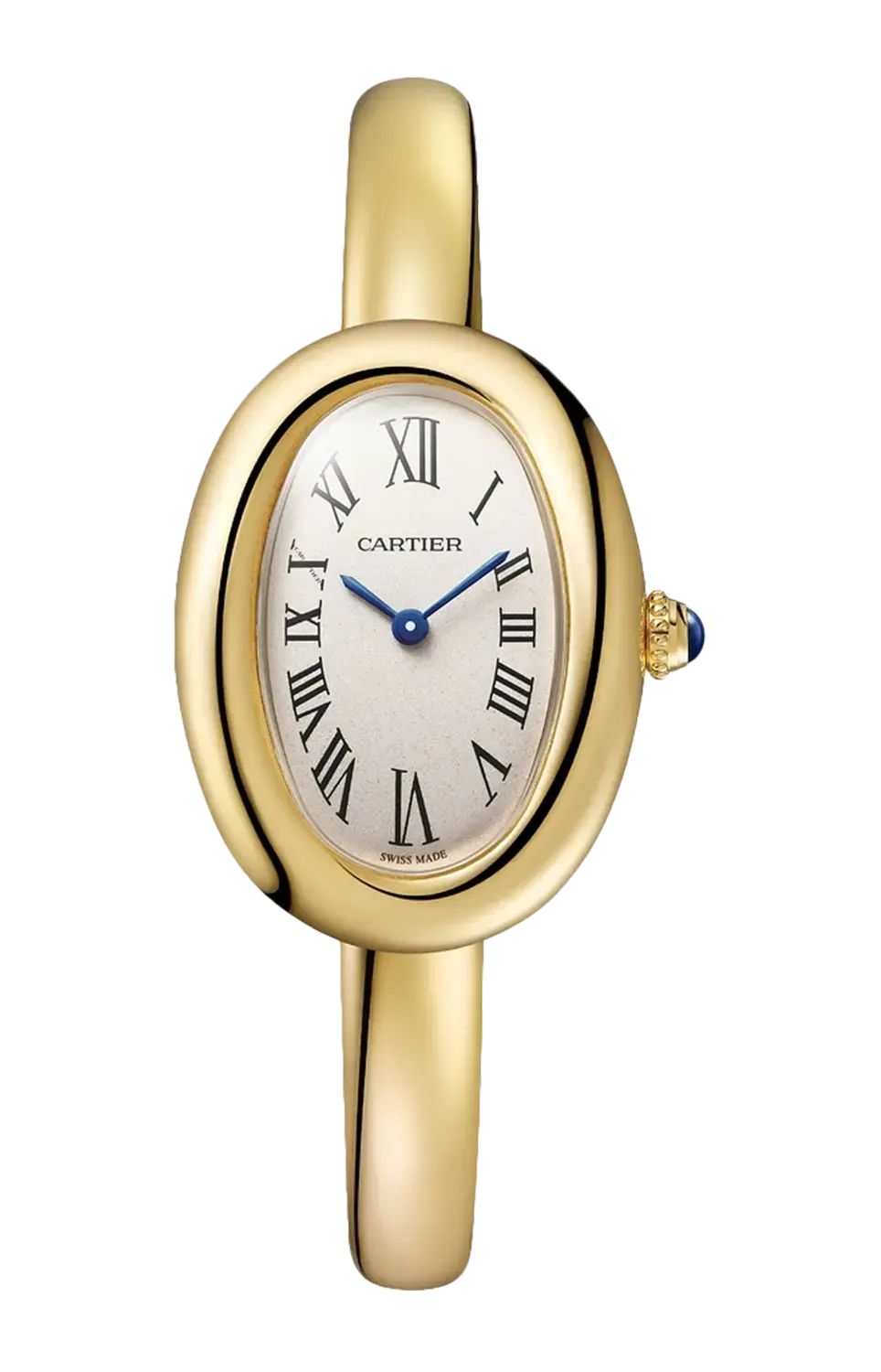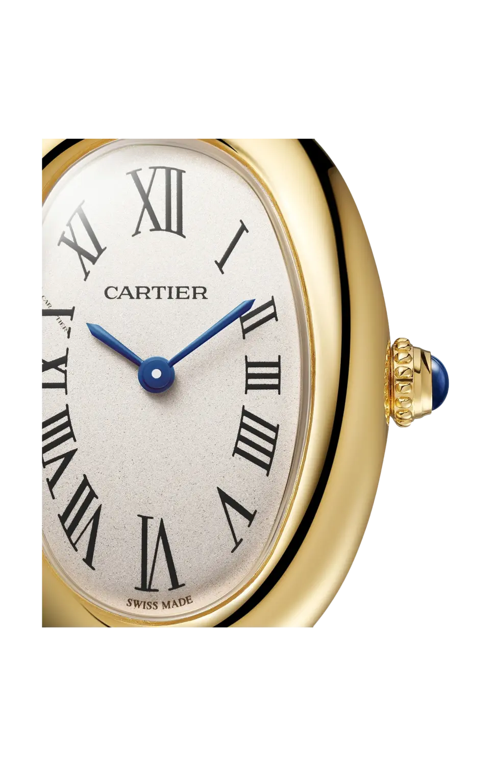 Часы Baignoire de Cartier, маленькая модель, размер 15, кварцевый механизм. Корпус из желтого золота 750/1000 пробы. Жемчужная заводная головка из желтого золота 750/1000 пробы с сапфиром-кабошоном. Жесткий браслет из желтого золота 750/1000 пробы. Серебряный циферблат, стрелки в форме мечей из вороненой стали, сапфировое стекло. Размеры корпуса 31,4 х 23,1 мм, толщина 6,9 мм. Водонепроницаемость до 30 метров.