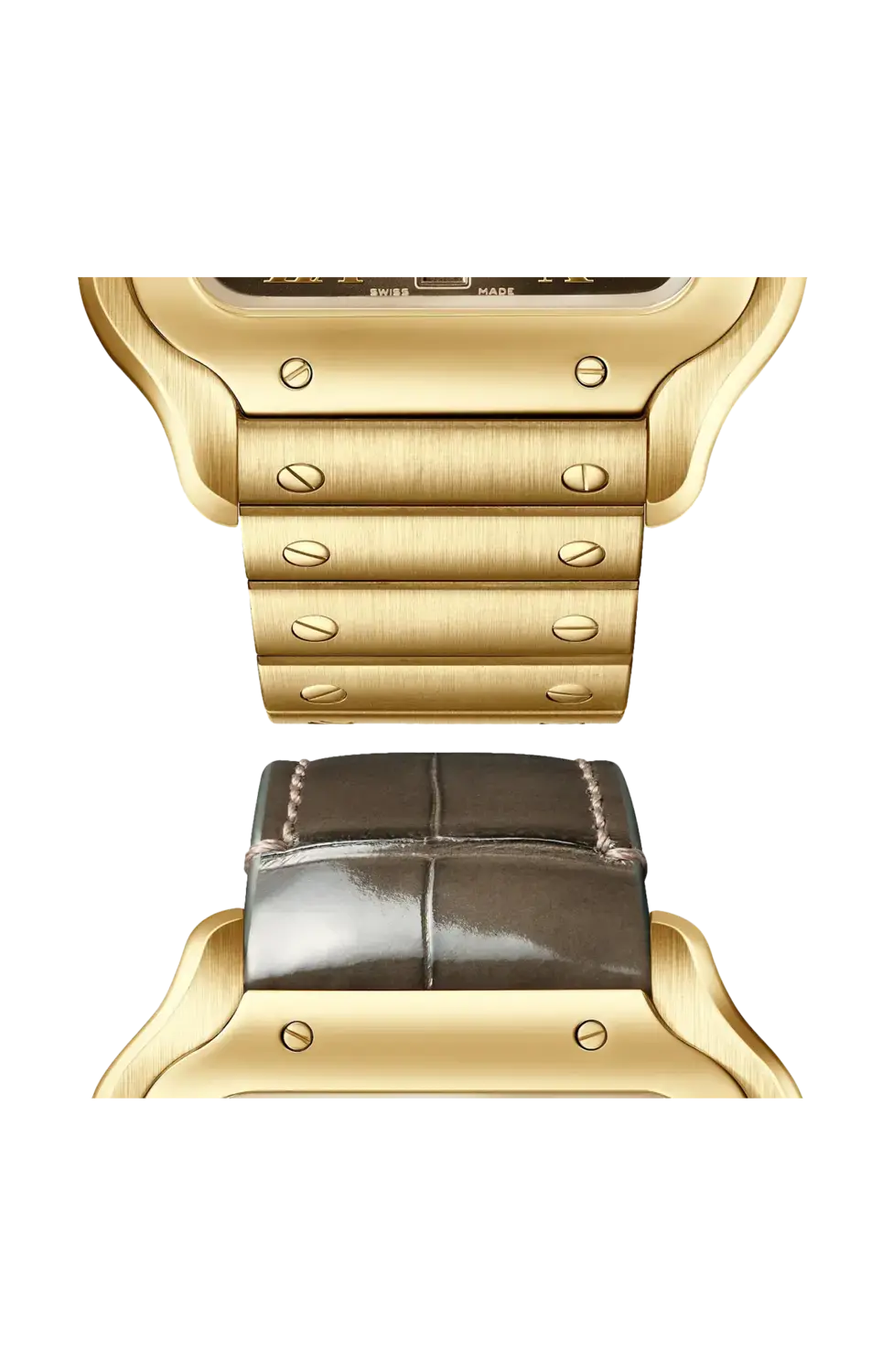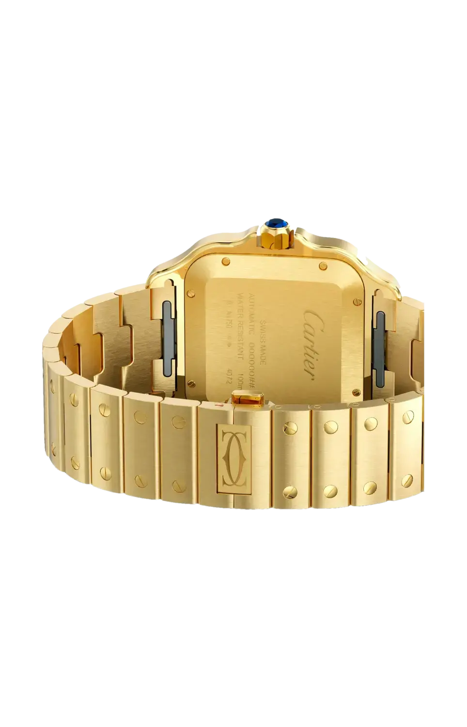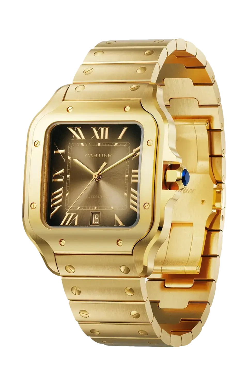 Бренд: Cartier Часы Santos de Cartier, крупная модель, механизм с автоподзаводом, калибр 1847 MC. Корпус из желтого золота 750/1000 пробы, семиугольная заводная головка, украшенная граненым синим сапфиром, сатинированный золотой циферблат с эффектом солнечных лучей, стрелки в форме мечей из полированной золотистой стали, сапфировое стекло. Браслет из желтого золота с системой регулировки размера «smartlink». Второй коричневый ремешок из кожи аллигатора со сменной золотой раскладывающейся застежкой. Браслет и ремешок оснащены системой смены «быстрый переключатель». Ширина корпуса 39,8 мм, толщина 9,38 мм. Водонепроницаемость до 100 метров.