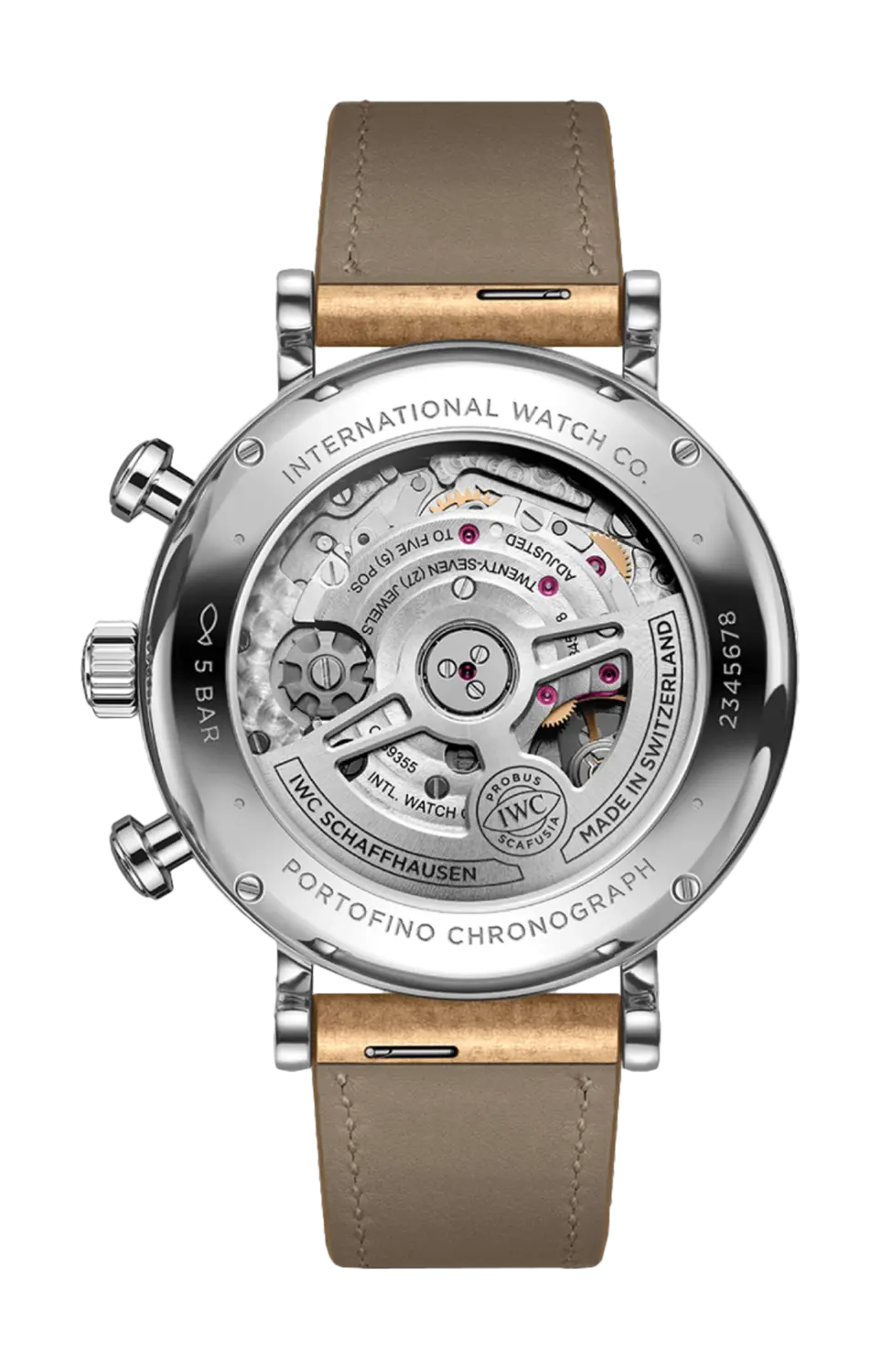 Модель Portofino Chronograph 39 оснащена калибром 69355 производства IWC и задней крышкой из сапфирового стекла.