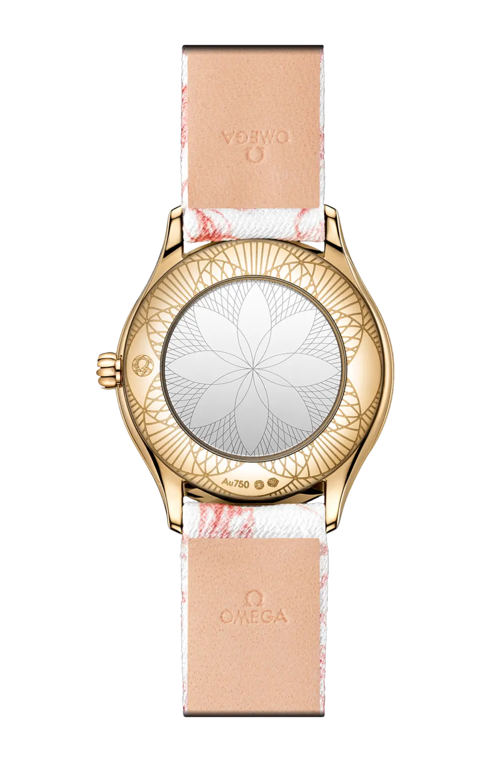 Бренд: Omega Мини-трезор — элегантное творение из самой современной женской коллекции Omega. Благодаря небольшому размеру и динамичному стилю эти часы точно не останутся незамеченными. Модель из 18-каратного самогонного золота имеет корпус диаметром 26 мм с элегантно расположенными по краям бриллиантами. Однако на заводной головке установлен один бриллиант, окруженный красным цветком из жидкой керамики. Куполообразный циферблат выполнен из кремовой эмали «Grand Feu» и украшен стрелками из 18-каратного лунного золота с бриллиантовой огранкой и розовыми накладными римскими цифрами-маркерами. К часам прилагается эксклюзивный ремешок из ткани туаль-де-жуи с красным цветочным узором. Внутри часов установлен калибр Omega 4061, скрытый металлической зеркальной задней крышкой из сапфирового стекла, украшенной мотивом «ее время».