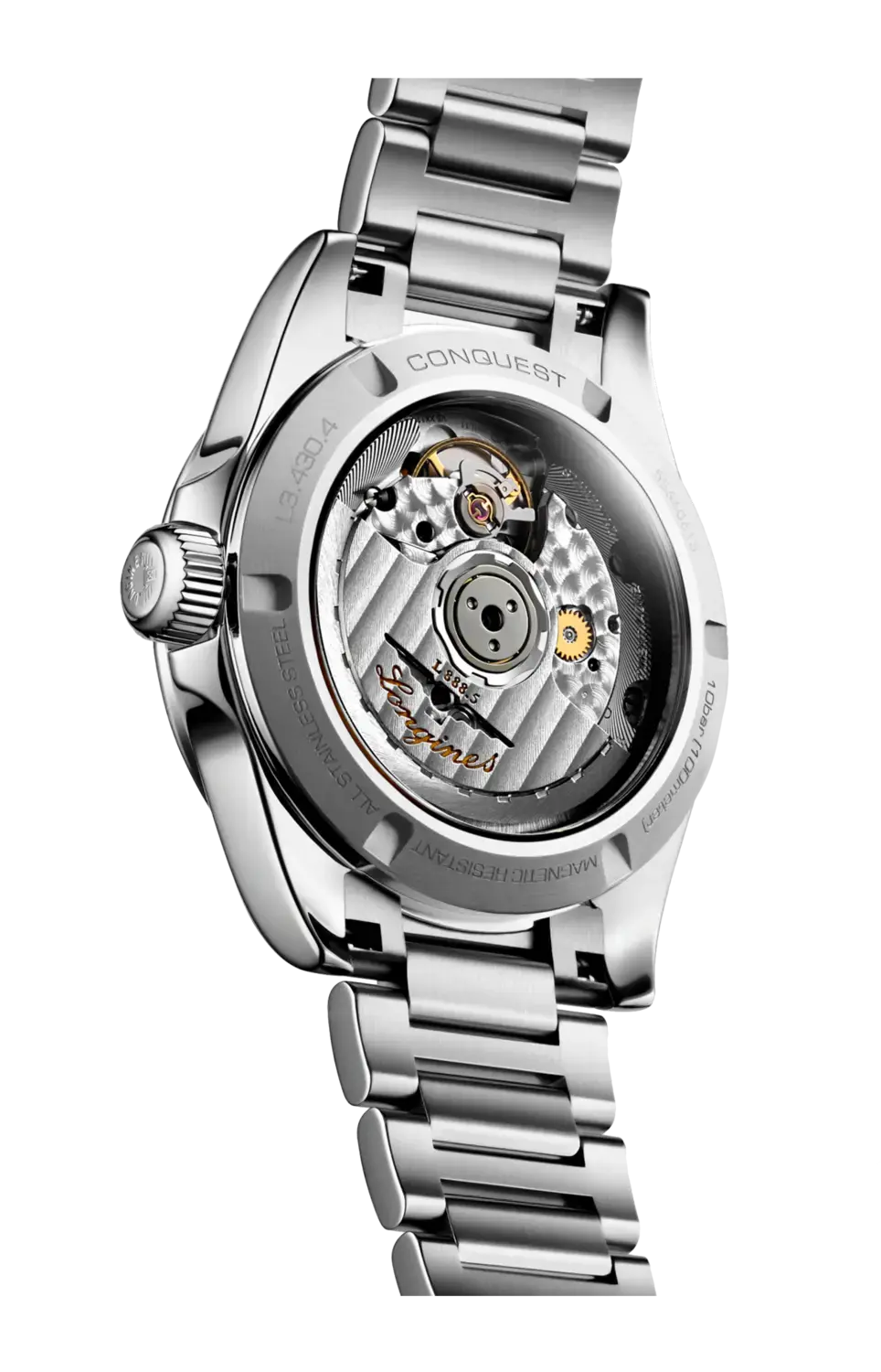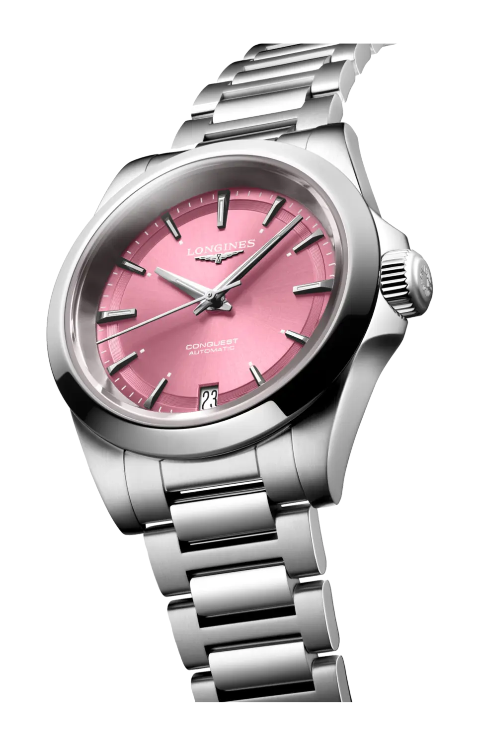 Эти новые часы Conquest оснащены эксклюзивным механизмом Longines с автоматическим подзаводом. Представленные в стальном корпусе диаметром 34 мм, водонепроницаемом до 10 бар (100 м), они оснащены розовым циферблатом с отделкой «солнечные лучи», стрелками с родиевым покрытием и накладными часовыми метками с родиевым покрытием и покрытием Superluminova. Указатель даты находится в положении «6 часов». Модель дополнена браслетом из нержавеющей стали.