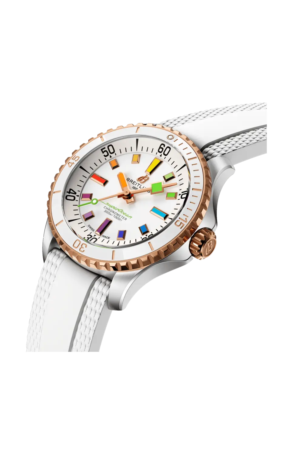 Технические характеристики: Коллекция: SUPEROCEAN Категория: ONLY TIME Механизм: Автоматический Размеры корпуса: диаметр 36 мм Материал: Сталь, розовое золото Ремешок: Резина Водонепроницаемый : 30 ATM Циферблат: БЕЛЫЙ Стекло: САПФИР Застежка: Складывающаяся Для кого: Женщины