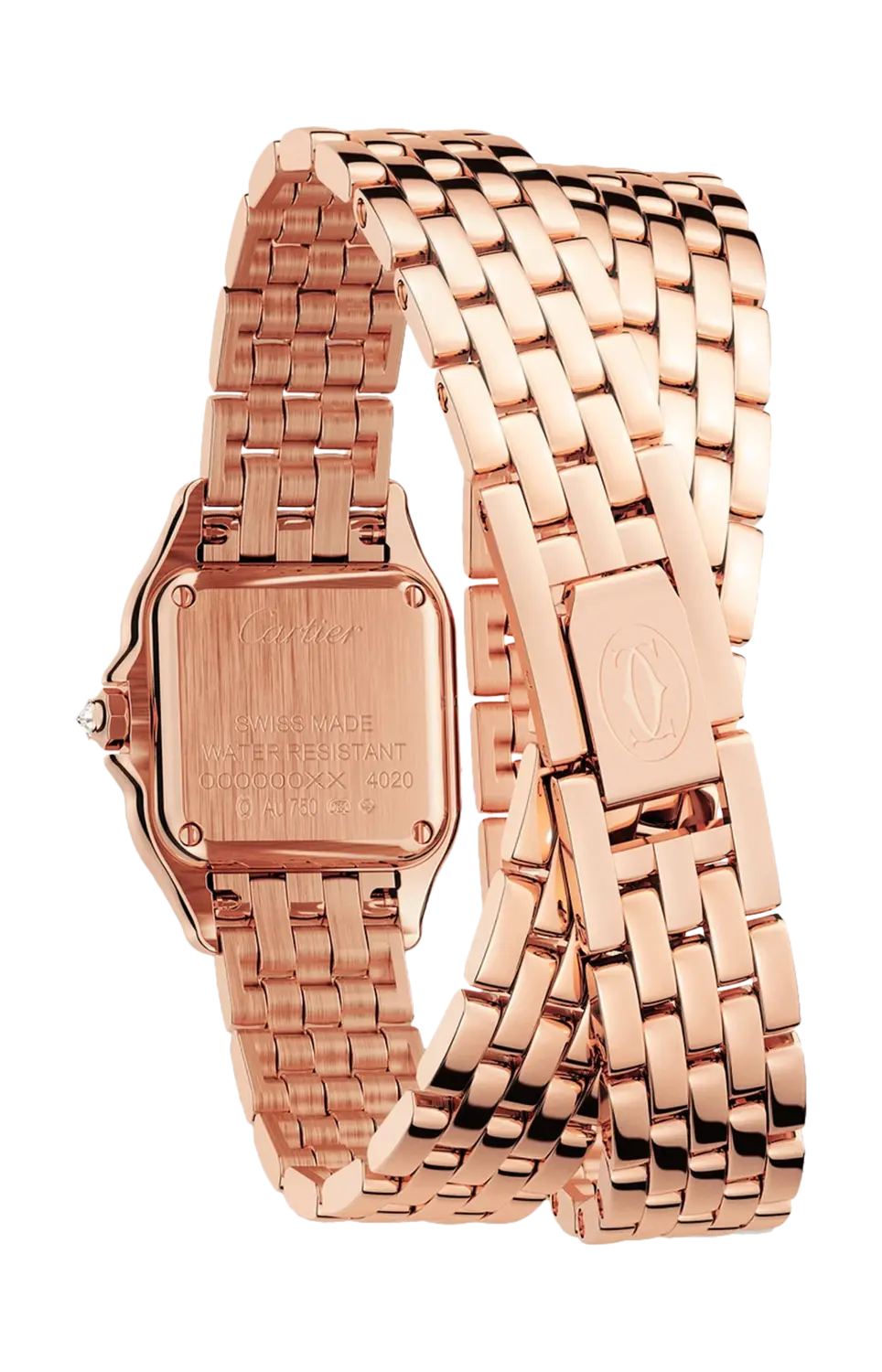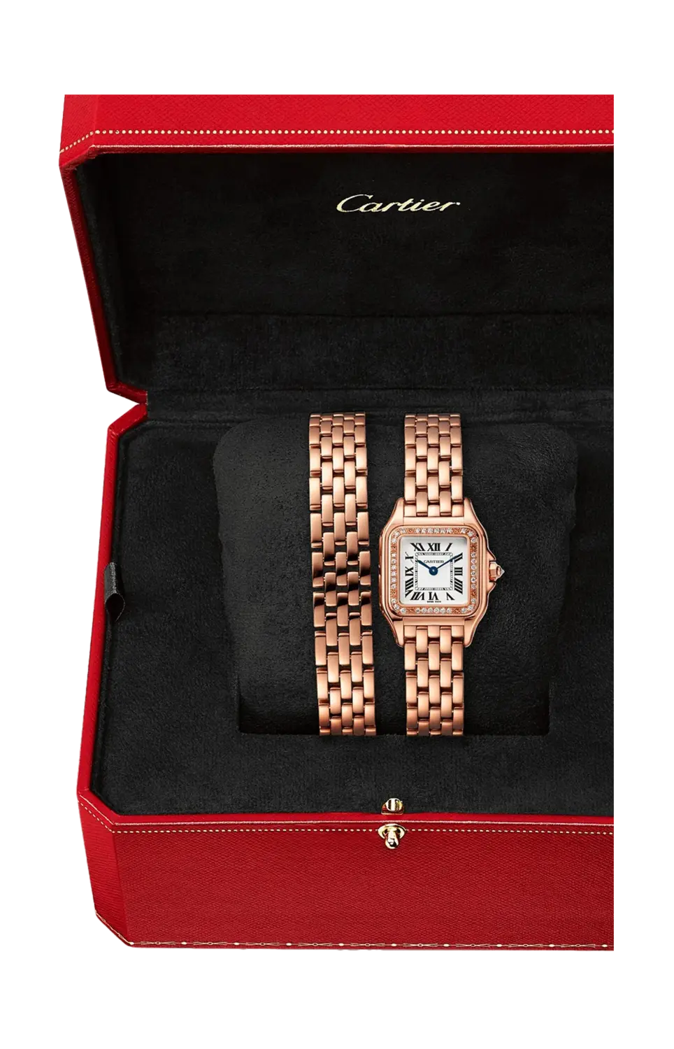 Часы Panthere de Cartier, маленькая модель, кварцевый механизм. Корпус из розового золота 750/1000 с бриллиантами классической огранки, размеры 22 x 30 мм, толщина 6 мм, заводная головка с бриллиантом, посеребренный циферблат, стрелки в форме мечей из вороненой стали, двойной браслет из розового золота 750/1000 пробы, водонепроницаемость до 30 метров. Неконтрактное фото (длина браслета часов может незначительно отличаться).