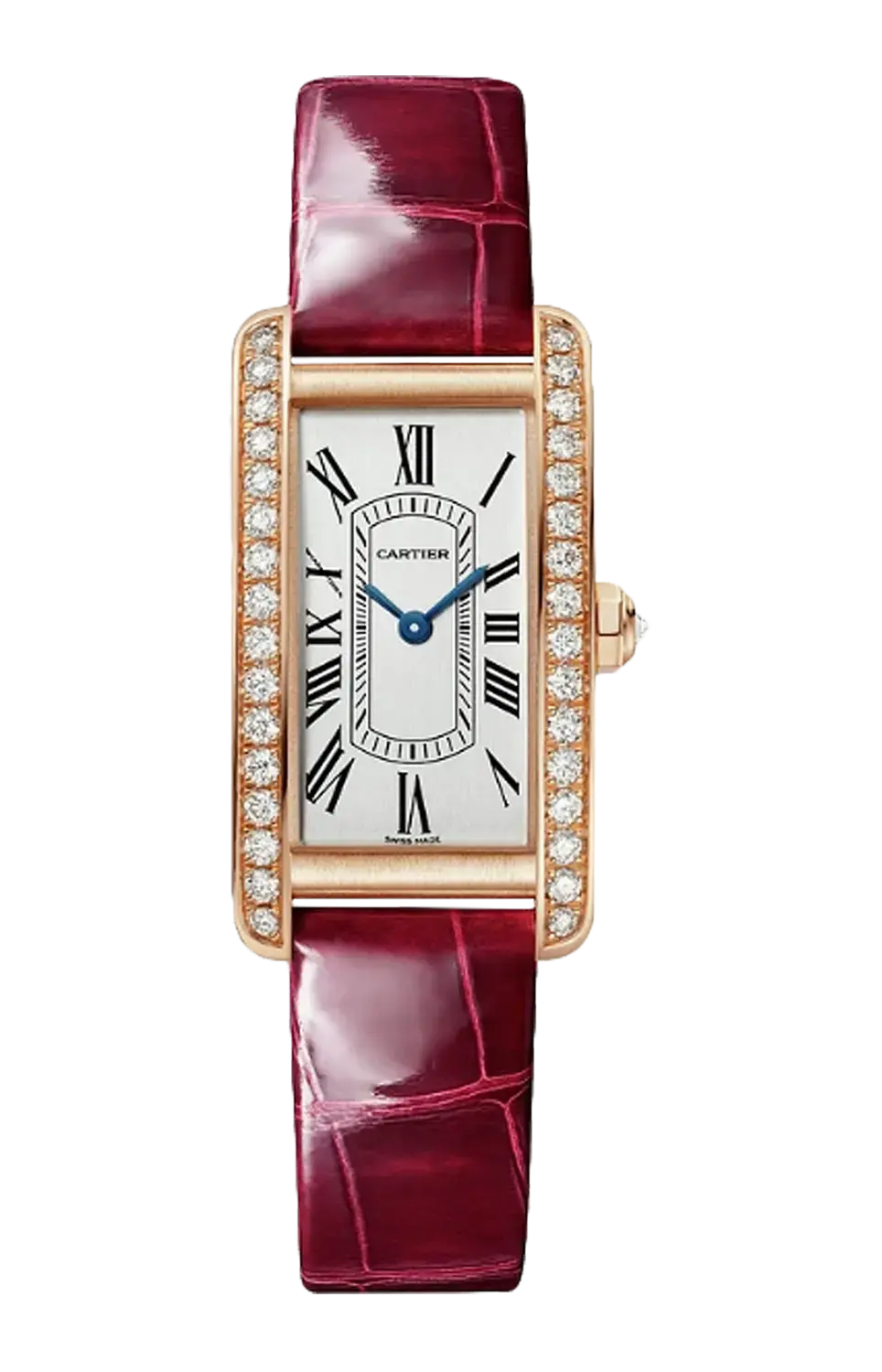 Американские танковые часы, маленькая модель, кварцевый механизм. Корпус из розового золота 750/1000 пробы и граненая заводная головка, украшенная 33 бриллиантами классической огранки общим весом 0,96 карата. Циферблат из сатинового серебра, стрелки в форме мечей из вороненой стали, сапфировое стекло. Блестящий красный ремешок из кожи аллигатора, застежка из розового золота 750/1000 пробы. Размер корпуса: 35,4 x 19,4 мм, толщина: 6,8 мм. Водонепроницаемость до 3 бар (около 30 метров).