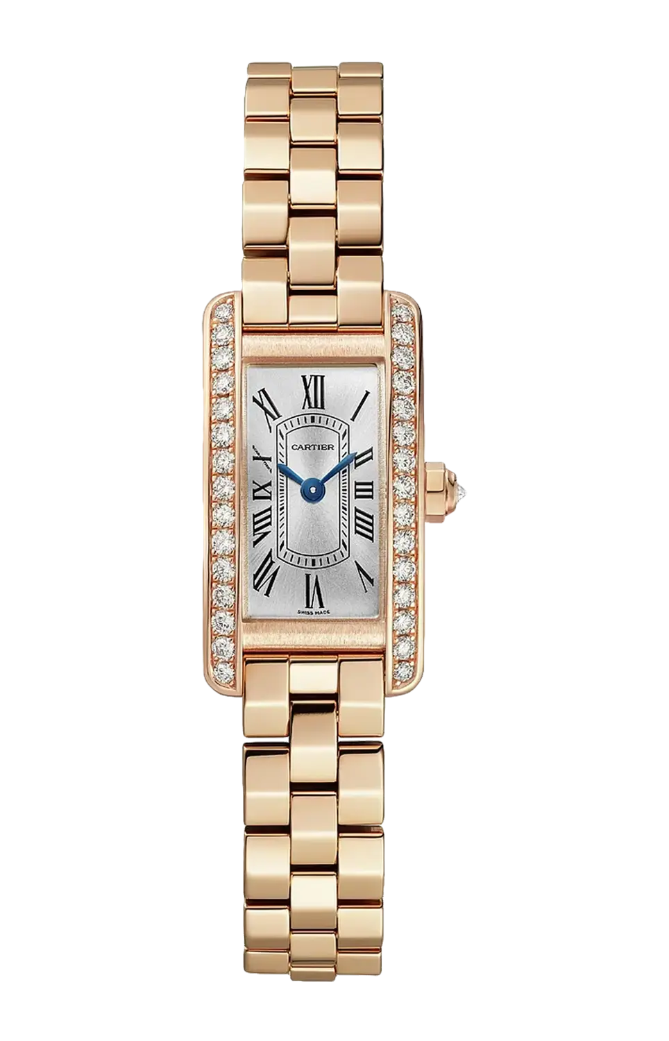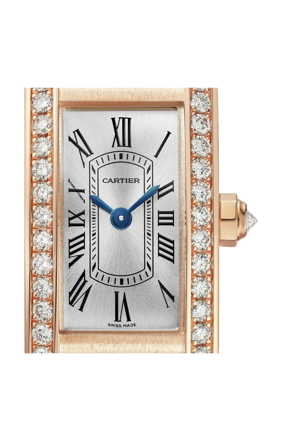 Бренд: Cartier Американские танковые часы, мини-модель, кварцевый механизм. Корпус из розового золота 750/1000 пробы и граненая заводная головка, украшенная 31 бриллиантом классической огранки общим весом 0,55 карата. Серебряный циферблат с узором «солнечные лучи», стрелки в форме мечей из вороненой стали, сапфировое стекло. Браслет из розового золота 750/1000 пробы. Тройная застежка из розового золота 750/1000 пробы. Размер корпуса: 28 мм х 15,2 мм, толщина: 6,5 мм. Водонепроницаемость до 3 бар (около 30 метров).