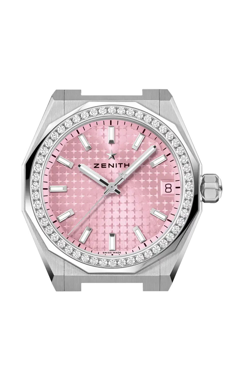 Часы Defy Skyline с восьмиугольным стальным корпусом диаметром 36 мм и граненым безелем, инкрустированным бриллиантами, выделяются циферблатом с эффектом «soleil» пастельно-розового цвета, вдохновленным символической четырехконечной звездой Зенита. Модель оснащена элитным автоматическим механизмом 670. Сменный стальной браслет и розовый каучуковый ремешок с мотивом, вдохновленным культовой звездой Зенита. Часы оснащены вторым ремешком, чтобы в полной мере ощутить их взаимозаменяемость.