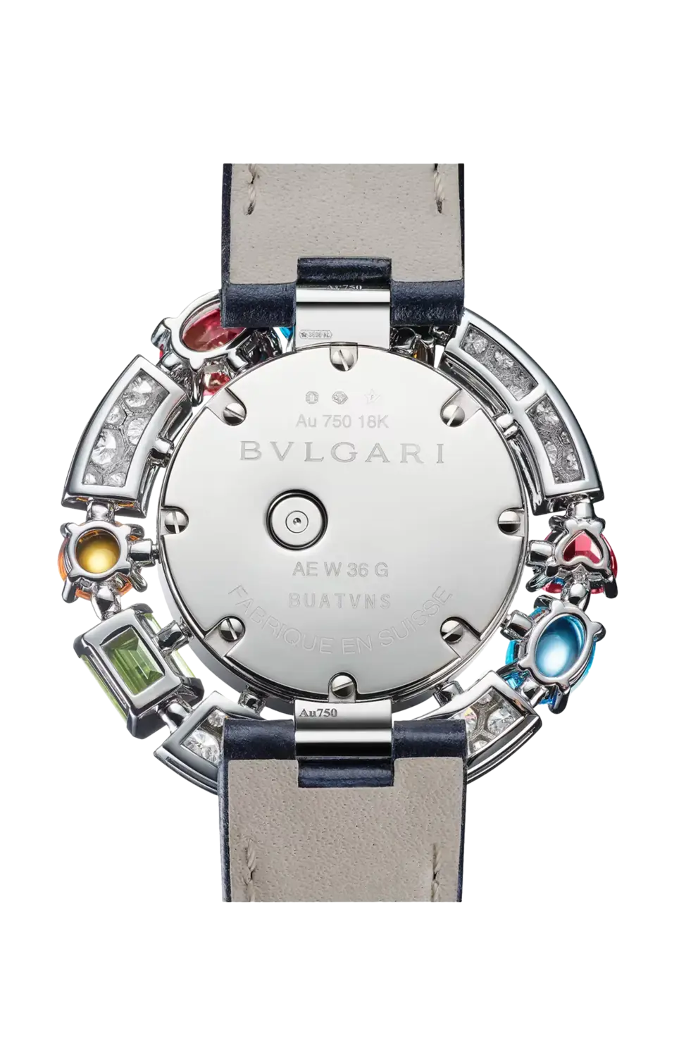 Часы Allegra, корпус из белого золота 18 карат, бриллианты классической огранки, два цитрина, один аметист, два голубых топаза, один перидот и два родолита, перламутровый циферблат, индексы с 12 бриллиантами и сверкающий синий ремешок из кожи аллигатора. Водонепроницаемость до 30 метров.