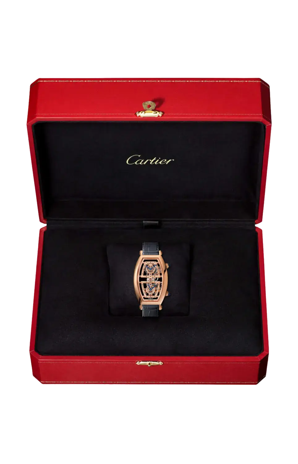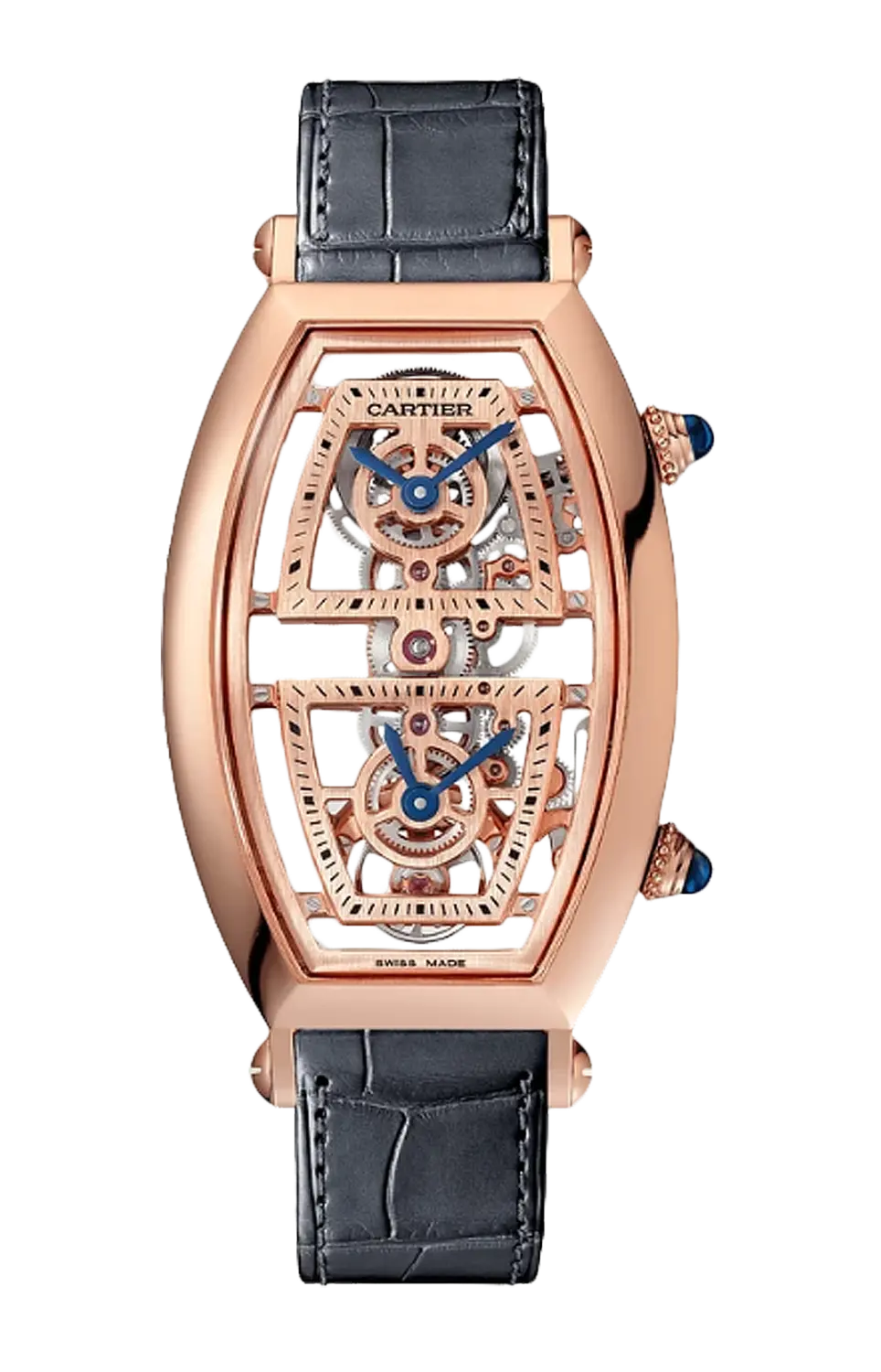 Бренд: Cartier Очень большая модель скелетонизированных часов Tonneau, мануфактурный механизм с ручным заводом, калибр 9919 MC. Корпус из розового золота 750/1000, две жемчужные заводные головки, каждая из которых украшена синим сапфиром-кабошоном, стрелки в форме мечей из вороненой стали, сапфировое стекло и задняя крышка, темно-серый ремешок из кожи аллигатора, раскладывающаяся застежка из розового золота 750/1000 1000. Усложнение с двумя часовыми поясами: два отдельных индикатора часов и минут, мосты, образующие скелетонированные циферблаты. Механизм с индивидуальной нумерацией, 197 деталей и 35 камней. Размеры 37,8 х 24 мм, толщина 7,9 мм, баланс 28 800 полуколебаний/час, запас хода около 60 часов. Размеры корпуса 52,4 х 29,8 мм, толщина 10,4 мм. Водонепроницаемость до 30 метров.