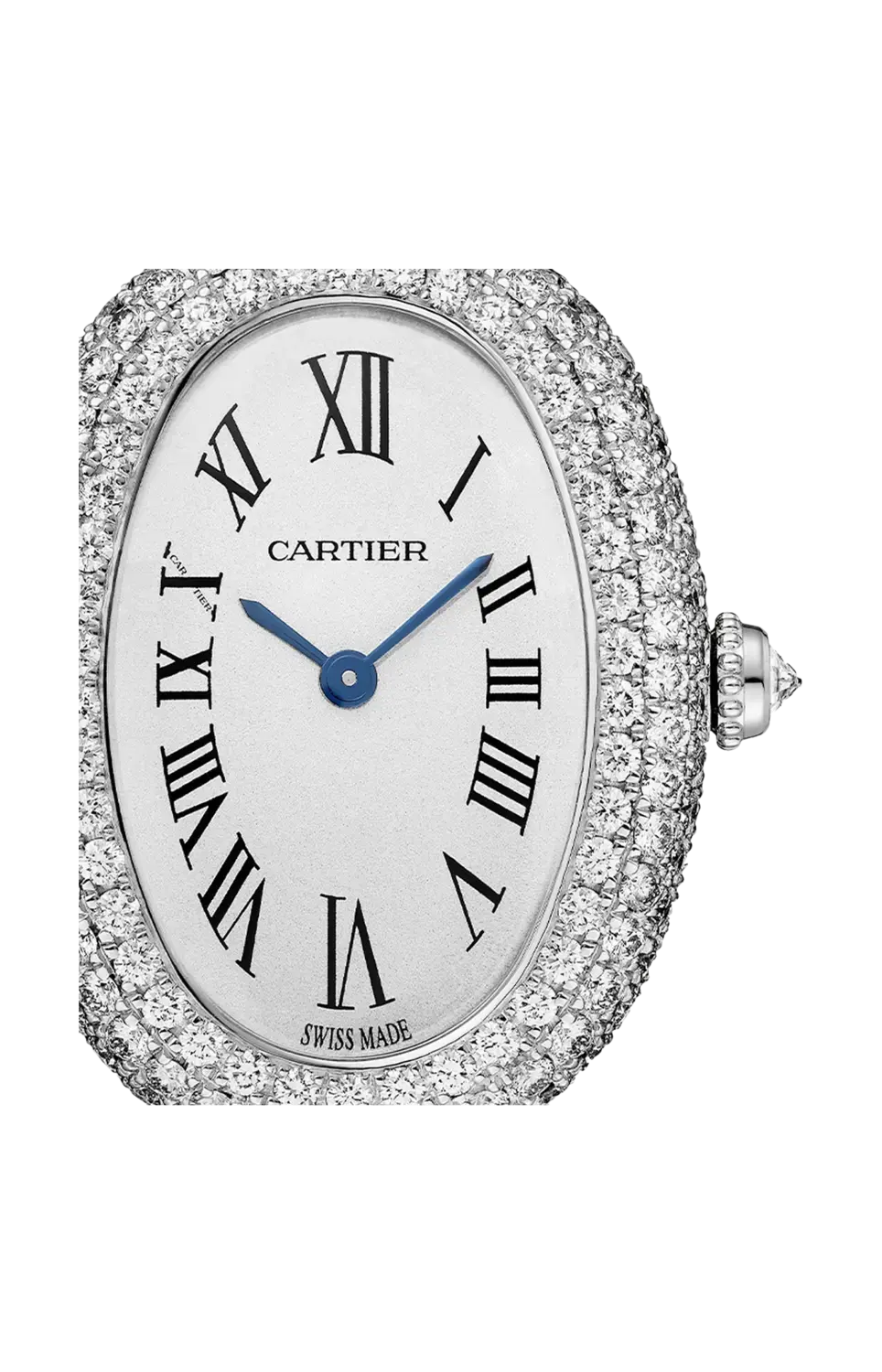 Часы Baignoire de Cartier, маленькая модель, кварцевый механизм. Корпус, заводная головка и браслет из белого золота 750/1000 пробы с родиевым покрытием, 1026 бриллиантов классической огранки (6,39 карата). Жемчужная заводная головка, посеребренный циферблат, стрелки в форме мечей из вороненой стали, сапфировое стекло. Размеры корпуса 31,4 х 23,1 мм, толщина 7,6 мм. Водонепроницаемость до 30 метров.