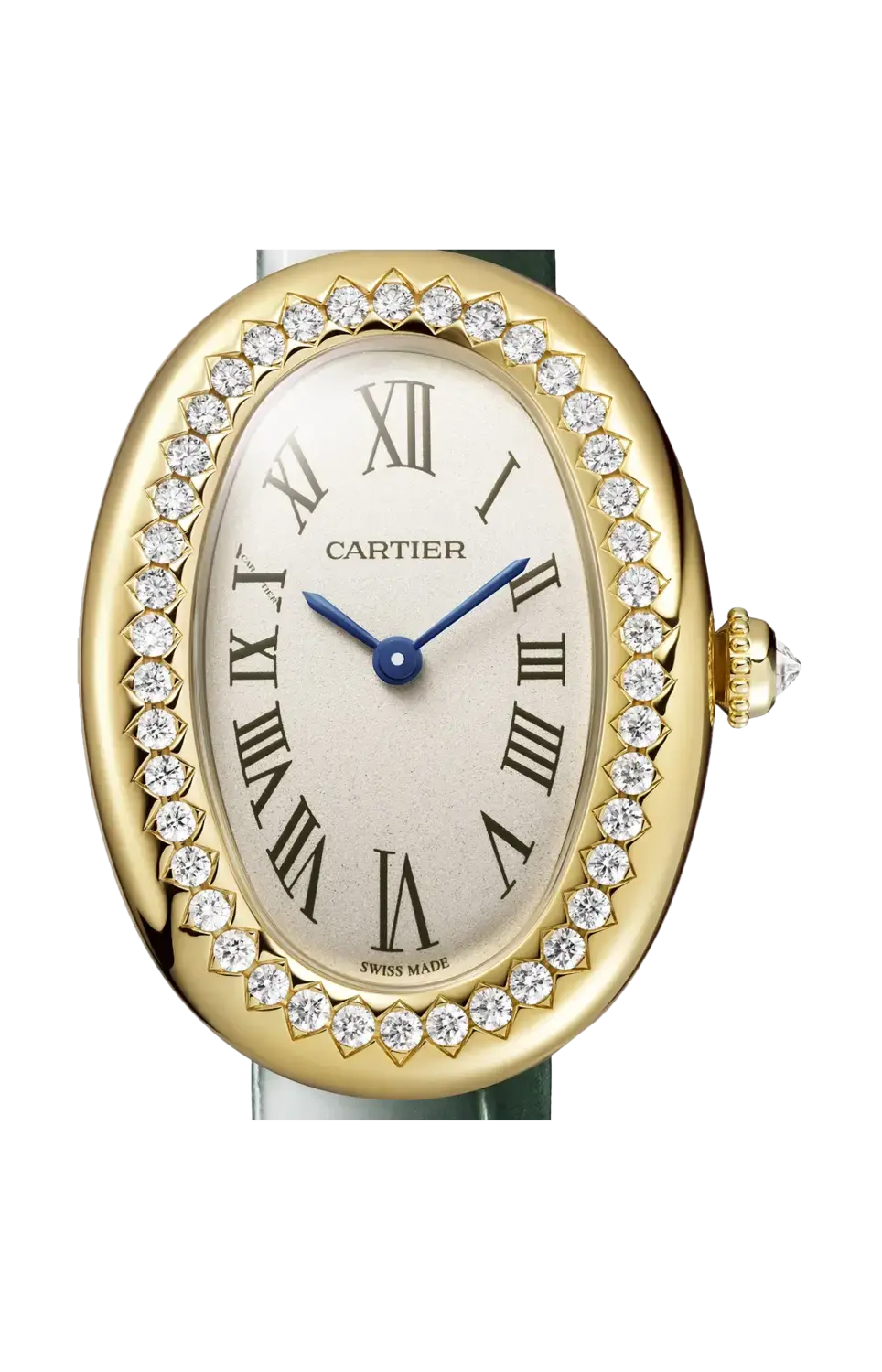 Бренд: Cartier Часы Baignoire de Cartier, маленькая модель, кварцевый механизм. Корпус из желтого золота 750/1000 пробы украшен 42 бриллиантами классической огранки (0,48 карата). Жемчужная заводная головка из желтого золота 750/1000 пробы с бриллиантом-кабошоном (0,08 карата). Серебряный циферблат, стрелки в форме мечей из вороненой стали, сапфировое стекло. Ремешок из кожи аллигатора зеленого цвета, застежка из желтого золота 750/1000 пробы. Размеры корпуса 31,4 х 23,09 мм, толщина 6,95 мм. Водонепроницаемость до 30 метров.