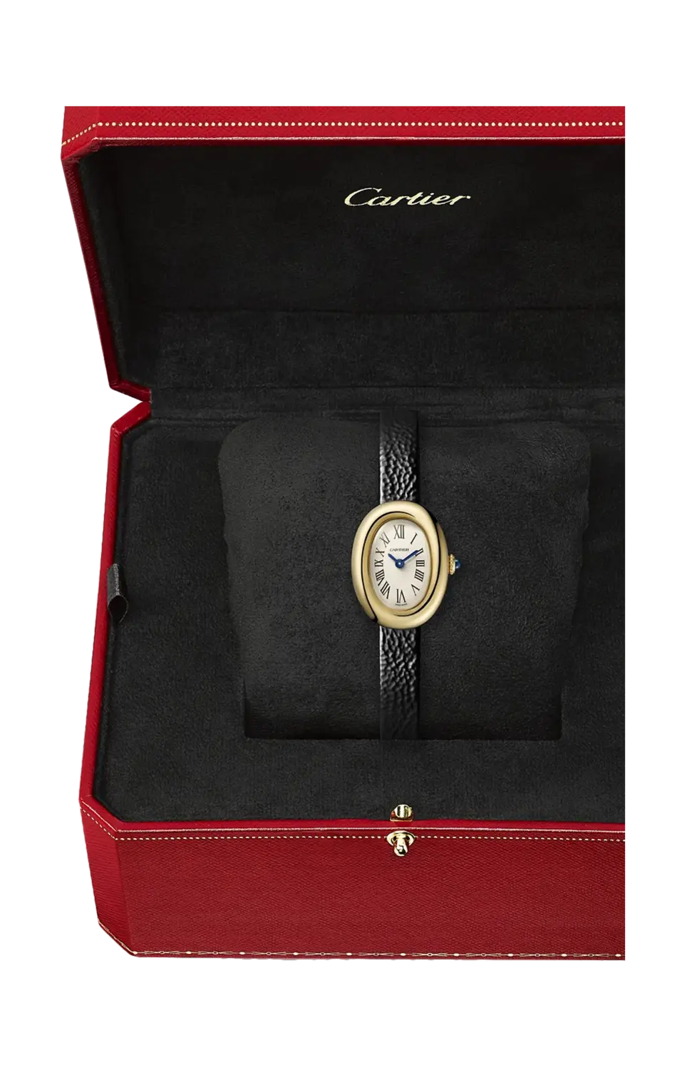 Часы Baignoire de Cartier, мини-модель, кварцевый механизм. Корпус из желтого золота 750/1000 пробы. Жемчужная заводная головка из желтого золота 750/1000 пробы с сапфиром-кабошоном. Серебряный циферблат. Серебряный циферблат, стрелки в форме мечей из вороненой стали, сапфировое стекло. Черный ремешок из лакированной кожи теленка. Размеры корпуса 24,6 х 18,7 мм, толщина 7,2 мм. Водонепроницаемость до 30 метров.