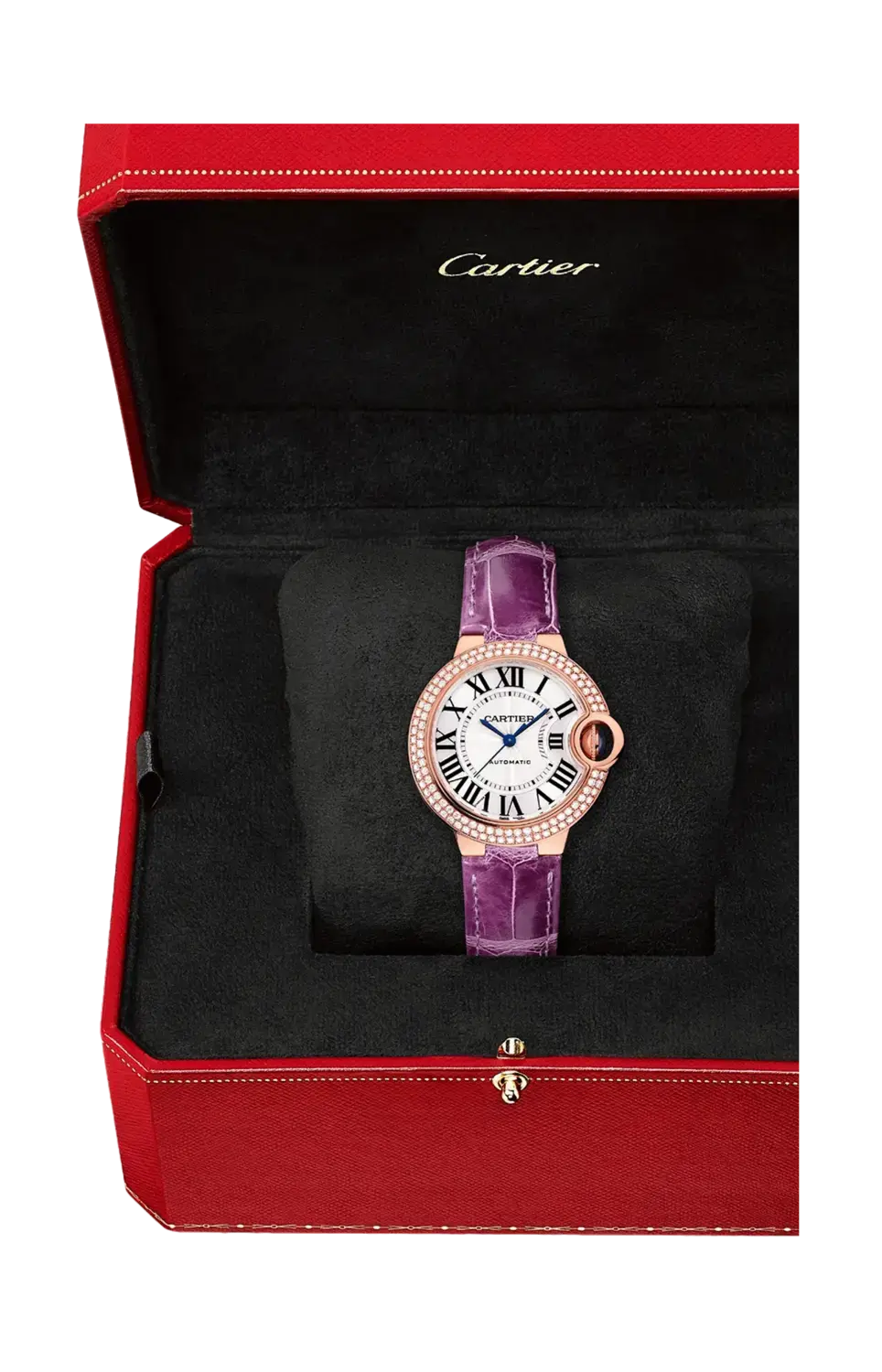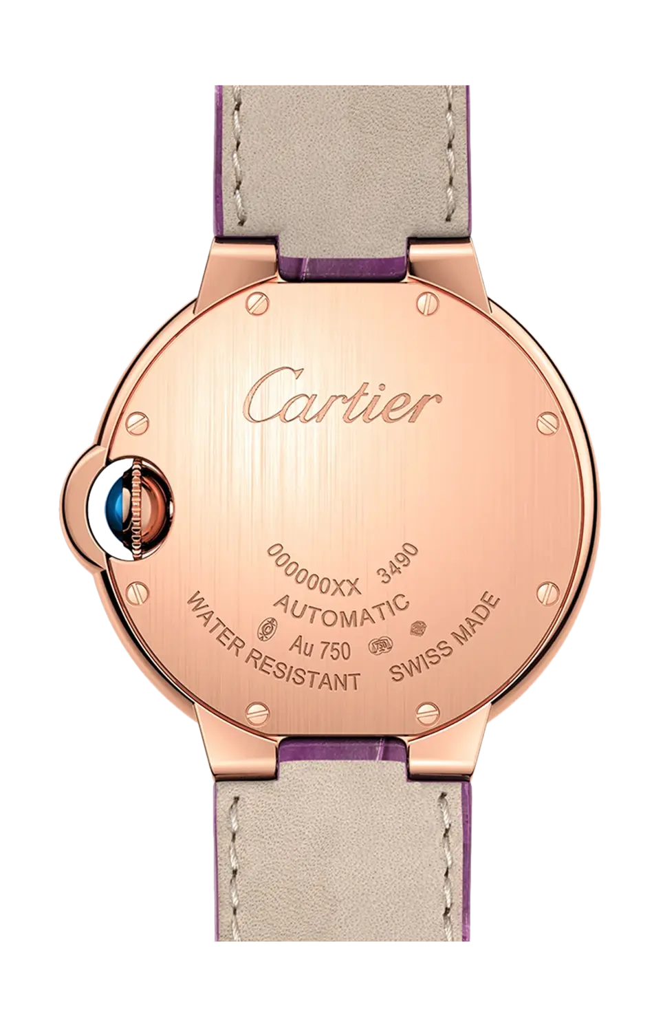 Бренд: Cartier Часы Cartier с синим шариком, 33 мм. Механический механизм с автоподзаводом. Корпус из розового золота 750/1000 пробы украшен 115 бриллиантами классической огранки (0,94 карата). Рифленая заводная головка украшена сапфиром-кабошоном. Посеребренный, гильошированный и опаловый лакированный циферблат. Стрелки в форме мечей из вороненой стали. Сапфировое стекло. Ремешок из кожи аллигатора фиолетового цвета, сменная раскладывающаяся застежка из розового золота 750/1000 пробы. Толщина 10,16 мм. Водонепроницаемость до 30 метров.