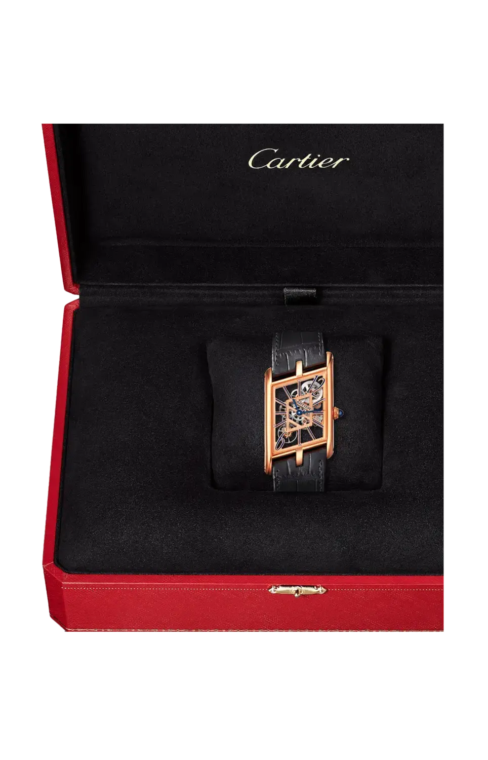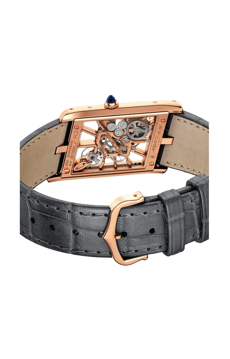 Бренд: Cartier Часы Asymétrique Tank, скелетонизированный, мануфактурный механизм с ручным заводом, калибр 9623 MC. Корпус из розового золота 750/1000, заводная головка из розового золота с жемчугом и сапфиром, стрелки в форме мечей из вороненой стали, два коричневых и темно-серых ремешка из кожи аллигатора, застежка из розового золота 750/1000. Часы, минуты со скелетонизированными мостами в виде синих лакированных арабских цифр. Механизм состоит из 112 компонентов, в том числе 22 рубинов. Размеры 32 х 21,10 мм, толщина 4,20 мм, баланс 28 800 полуколебаний/час, запас хода около 48 часов. Размеры корпуса 47,17 х 26,20 мм, толщина 7,82 мм. Ограниченное и пронумерованное издание в 100 экземпляров. Водонепроницаемость до 30 метров.