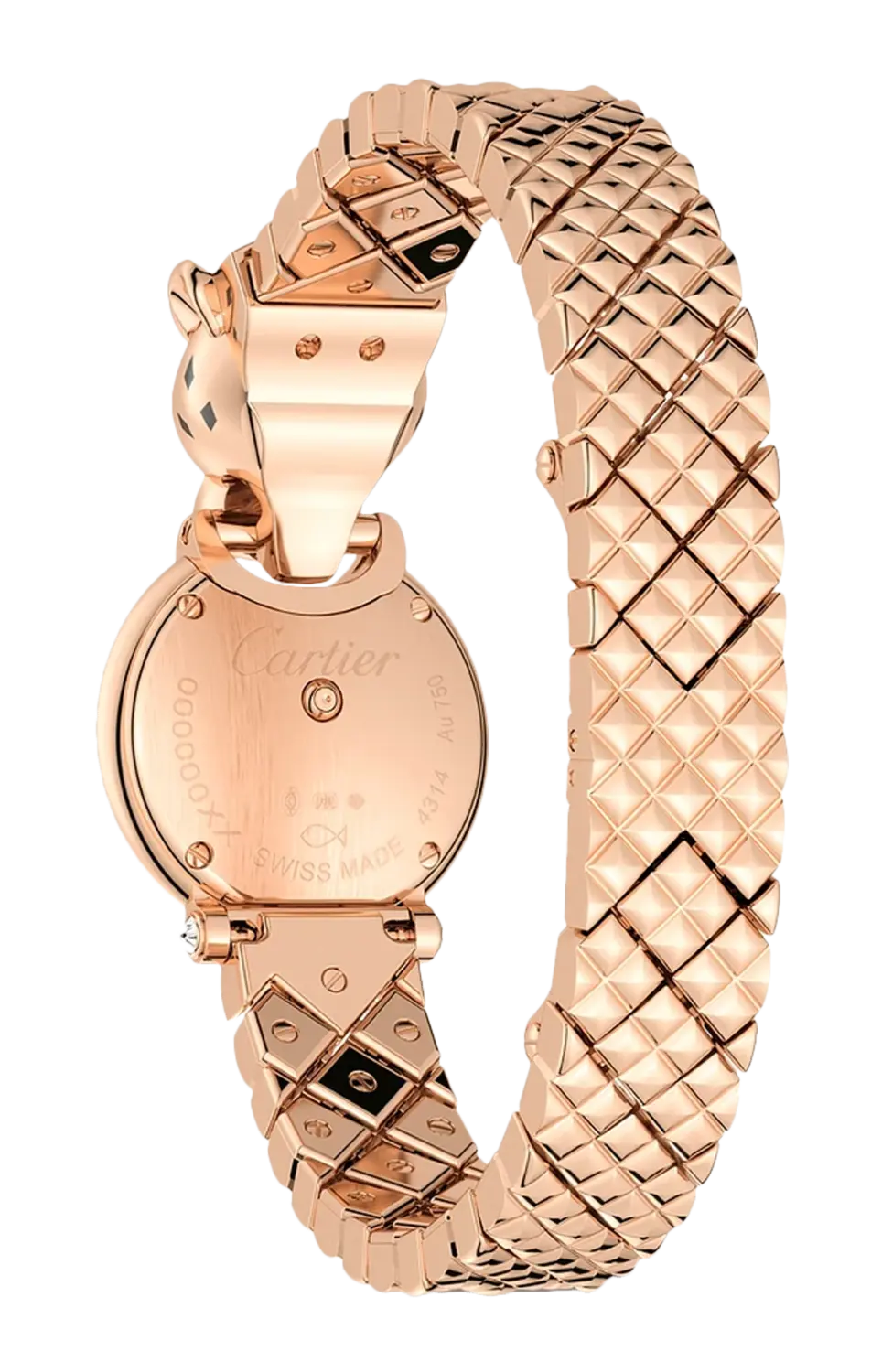 Часы La Panthère, 23,6 мм, кварцевый механизм. Корпус из розового золота 750/1000 с 40 бриллиантами классической огранки (0,24 карата), голова пантеры из розового золота 750/1000 пробы, глаза-цавориты грушевидной формы (0,16 карата), черные лаковые пятна и нос, розовый циферблат, меч в форме вороненой стали стрелки, браслет из розового золота 750/1000 пробы, застежка-булавка из розового золота 750/1000. Толщина 7,8 мм. Водонепроницаемость до 30 метров.