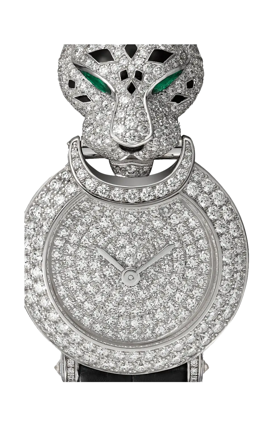 Бренд: Cartier Часы La Panthère, 23,6 мм, кварцевый механизм. Корпус из белого золота 750/1000 с родиевым покрытием, 136 бриллиантов классической огранки (1,04 карата), голова пантеры из белого золота 750/1000 с родиевым покрытием, 297 бриллиантов классической огранки (1,43 карата), изумрудные глаза грушевидной формы. (0,15 карата), точки и носик из черного лака, циферблат из белого золота 750/1000 с родиевым покрытием. инкрустирован 117 бриллиантами (0,54 карата), стрелки в форме мечей из стали с родиевым покрытием, полуматовый черный ремешок из кожи аллигатора, пряжка Ardillon из родиевого белого золота 750/1000 пробы с 24 бриллиантами классической огранки (0,23 карата). Толщина корпуса 7,8 мм. Водонепроницаемость до 30 метров.