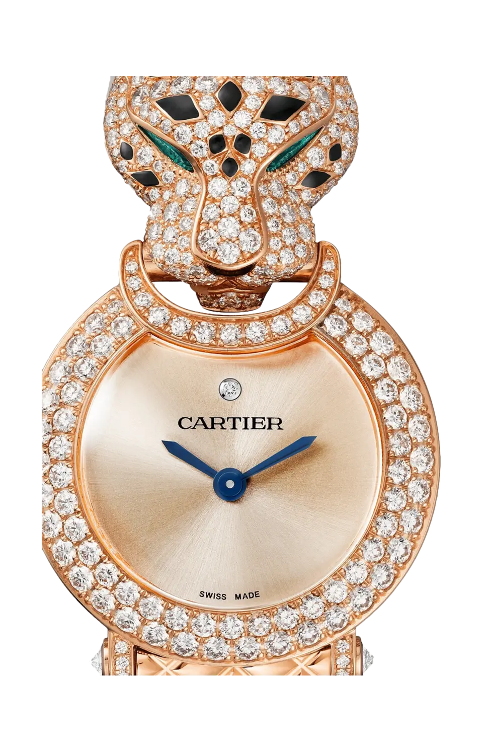 Часы La Panthère, 23,6 мм, кварцевый механизм. Корпус из розового золота 750/1000 пробы с 134 бриллиантами классической огранки (0,98 карата), голова пантеры из розового золота 750/1000 пробы с 298 бриллиантами классической огранки (1,43 карата), изумрудные глаза грушевидной формы, пятна и нос из черного лака, розовый циферблат, стальные стрелки в форме мечей с родиевым покрытием, сапфировое стекло, браслет из розового золота 750/1000. Толщина 7,78 мм. Водонепроницаемость до 30 метров.