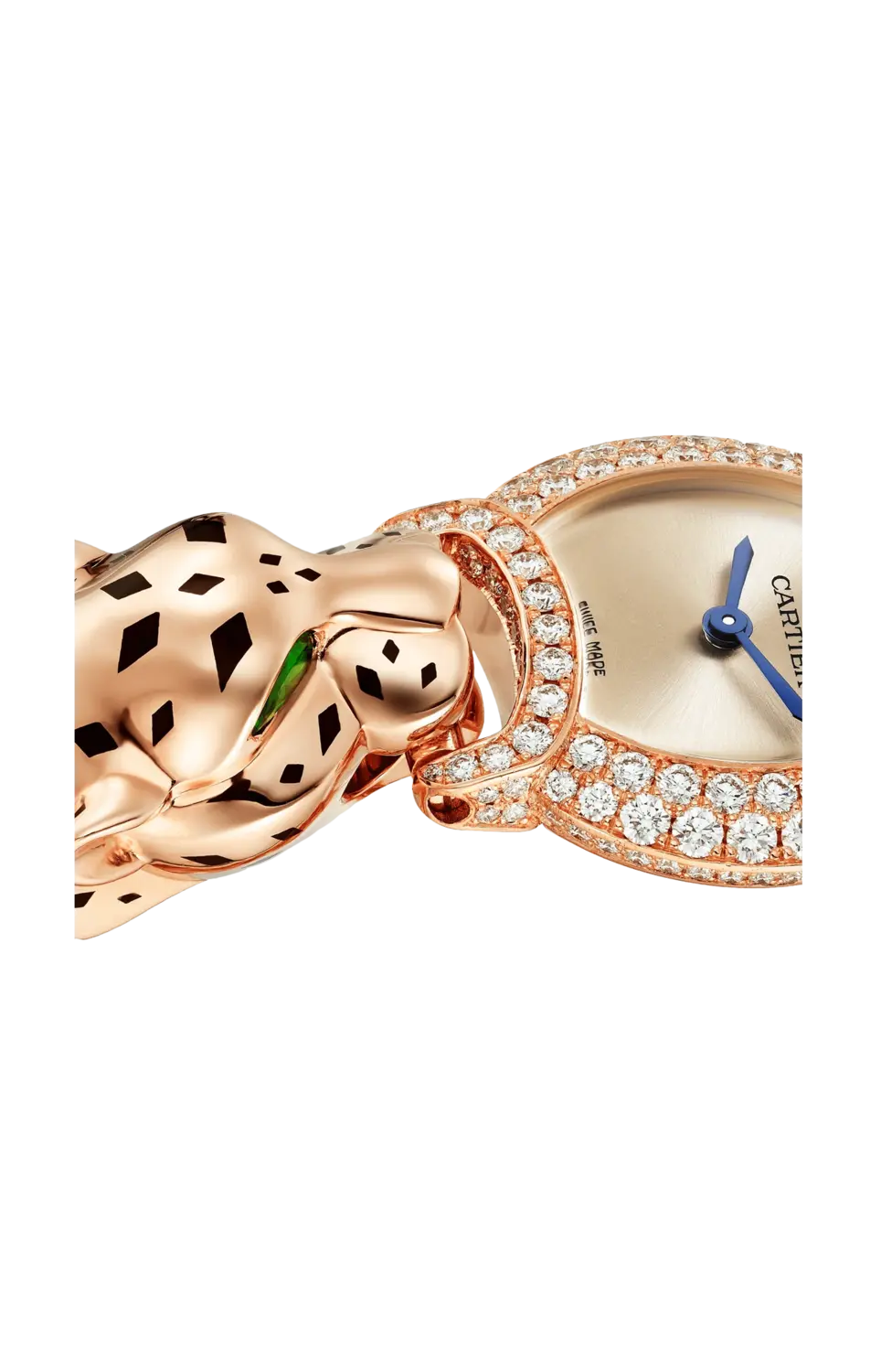 Часы La Panthère, 22,2 мм, кварцевый механизм. Корпус из розового золота 750/1000 со 128 бриллиантами классической огранки (1,08 карата), головы пантер из желтого золота 750/1000 пробы, глаза-цавориты грушевидной формы, черные лаковые пятна и нос, золотой циферблат, ромбовидные стрелки, гладиус из вороненой стали, сапфир кристалл, ремешок из желтого золота 750/1000 пробы. Толщина 7,55 мм. Водонепроницаемость до 30 метров.