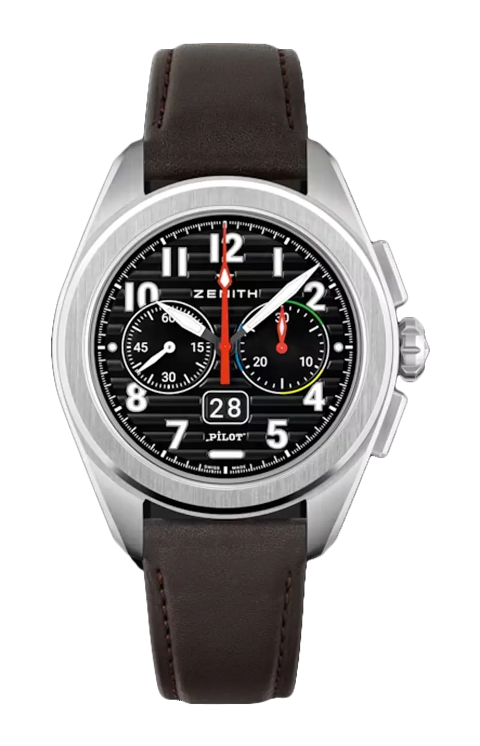 Бренд: Zenith Авиаторный хронограф Zenith возвращается с моделью Pilot Big Date Flyback. Корпус диаметром 42,5 мм из нержавеющей стали с увеличенной заводной головкой и черным текстурированным циферблатом с крупными люминесцентными арабскими цифрами и цветными метками для удобства чтения. В комплект поставки входят два сменных ремешка: один из черного каучука с эффектом «кордура», другой из коричневой телячьей кожи. Оснащен высокочастотным автоматическим калибром хронографа El Primero 3652 с большими функциями даты и обратного хода. Часы оснащены вторым ремешком, чтобы в полной мере ощутить их взаимозаменяемость.