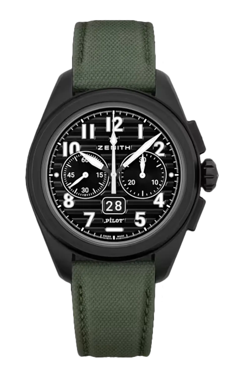 Бренд: Zenith Авиаторный хронограф Zenith возвращается с моделью Pilot Big Date Flyback. Корпус диаметром 42,5 мм из черной керамики с крупной заводной головкой и черным текстурированным циферблатом с большими люминесцентными арабскими цифрами. В комплект поставки входят два сменных каучуковых ремешка с эффектом кордуры: черного и хаки. Оснащен высокочастотным автоматическим калибром хронографа El Primero 3652 с большими функциями даты и обратного хода. Часы оснащены вторым ремешком, чтобы в полной мере ощутить их взаимозаменяемость.