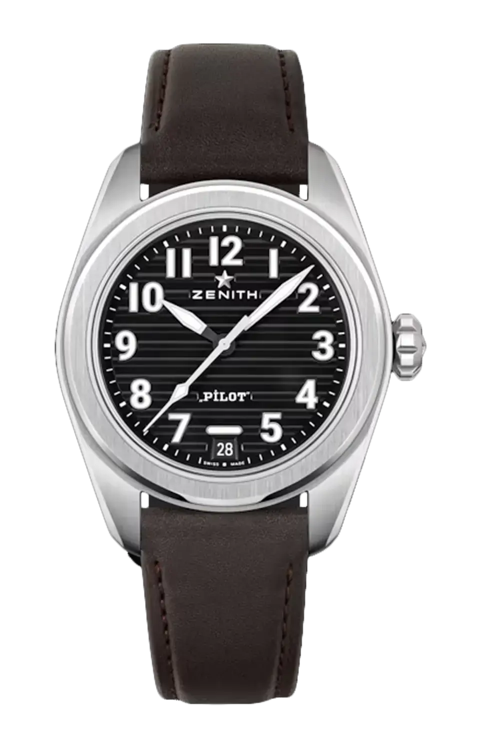 Бренд: Zenith Модель Pilot Automatic, созданная для нового поколения часов Zenith Pilot, имеет стальной корпус диаметром 40 мм с увеличенной заводной головкой и черным текстурированным циферблатом с большими люминесцентными арабскими цифрами. В комплект поставки входят два сменных ремешка: один из черного каучука с эффектом «кордура», другой из коричневой телячьей кожи. Часы оснащены автоматическим высокочастотным мануфактурным механизмом El Primero 3620. Чтобы в полной мере ощутить взаимозаменяемость, часы оснащены вторым ремешком.