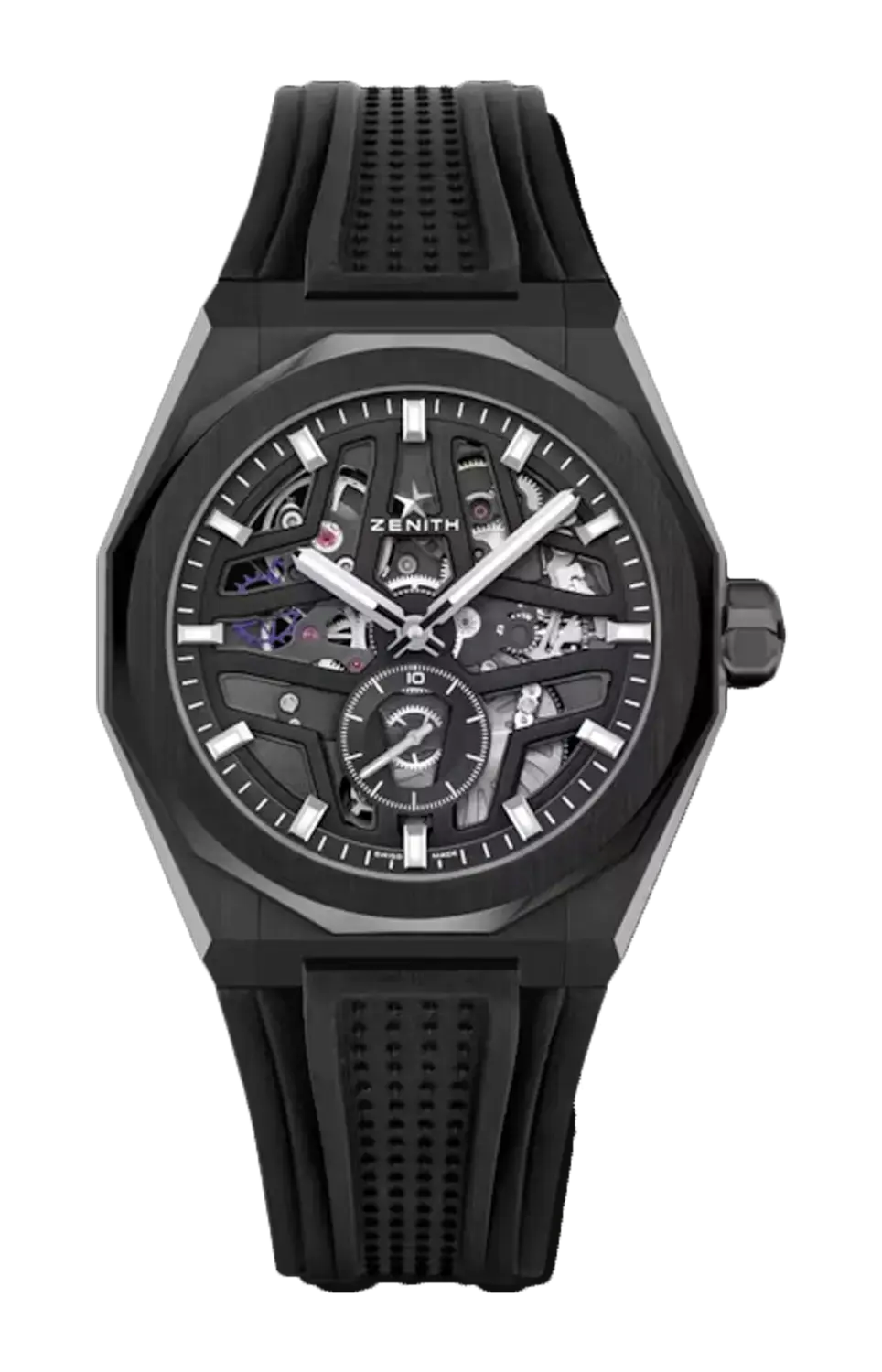 Бренд: Zenith Часы-скелетон бросающего вызов skyline с восьмиугольным корпусом из черной керамики диаметром 41 мм и граненым безелем выделяются черным открытым циферблатом, вдохновленным символической четырехконечной звездой Зенита. Механизм оснащен высокочастотным скелетонизированным автоматическим механизмом El Primero 3620 SK, оснащенным самым первым индикатором с точностью до 1/10 секунды. Сменный керамический браслет с узорчатым черным каучуковым ремешком. Часы оснащены вторым ремешком, чтобы в полной мере ощутить их взаимозаменяемость.
