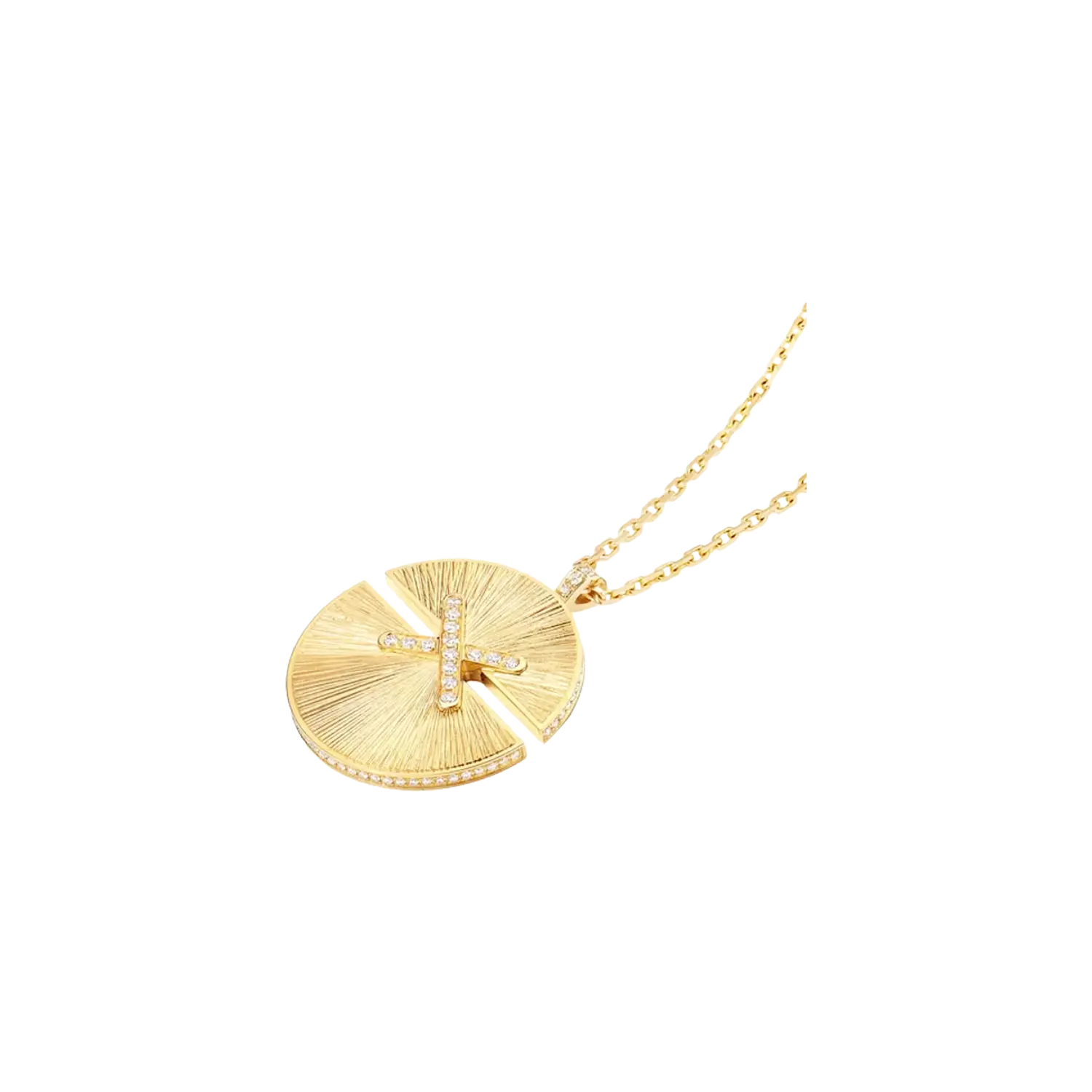 Крупный кулон Jeux de Liens Harmony из желтого золота с белыми бриллиантами классической огранки. Возможность гравировки трех регулировочных колец: 70, 75 и 80 см. Диаметр медали 25 мм.