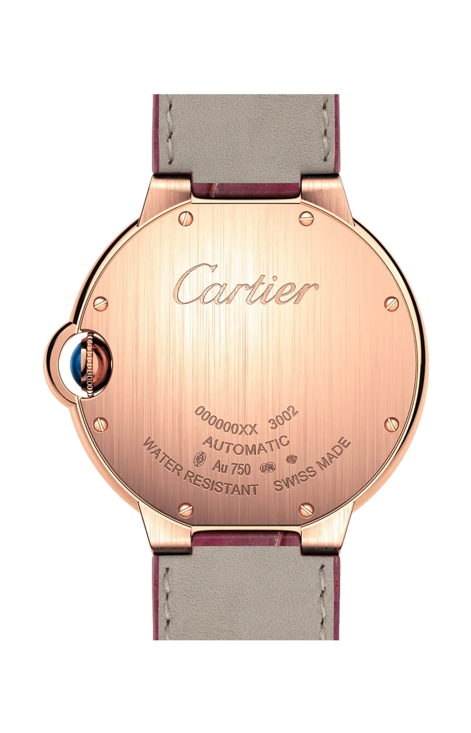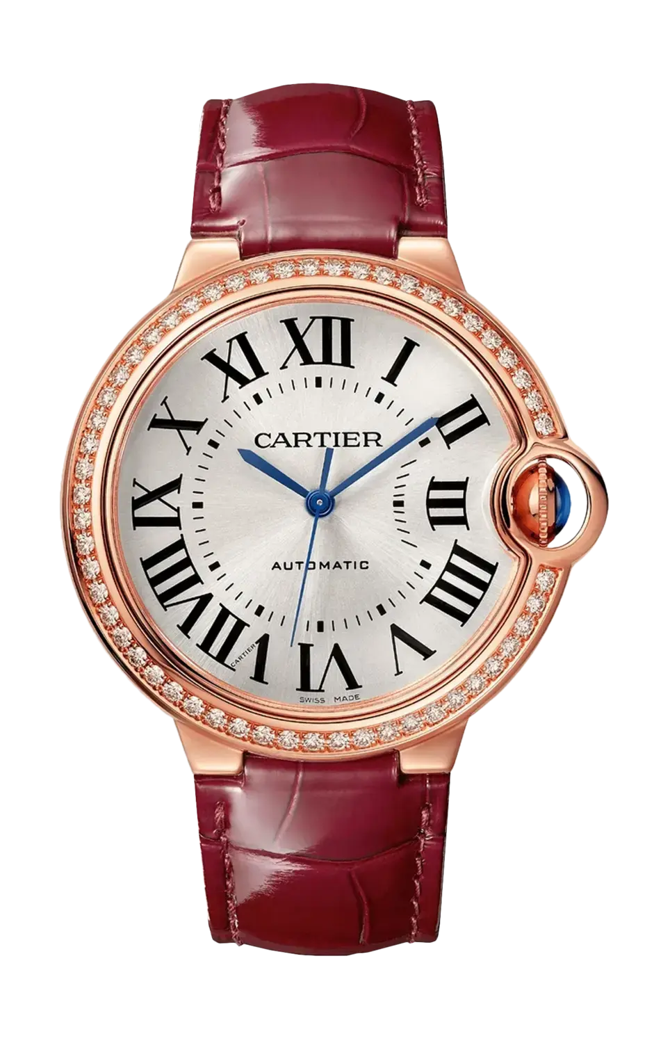 Часы Cartier с шариком синего цвета, 36 мм, механический механизм с автоподзаводом. Корпус из розового золота 750/1000 пробы украшен бриллиантами классической огранки. Рифленая заводная головка украшена сапфиром-кабошоном. Серебряный циферблат с солнечными лучами. Стрелки в форме мечей из вороненой стали. Сапфировое стекло. Ремешок из кожи аллигатора бордового цвета, застежка из розового золота 750/1000 пробы. Толщина корпуса 12,10 мм. Водонепроницаемость до 30 метров.