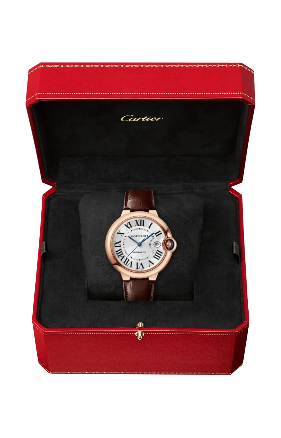 Часы de Cartier Balloon blue, диаметр 40 мм, механизм с автоподзаводом, калибр 1847 MC. Корпус из розового золота 750/1000, консервированная заводная головка с сапфиром-кабошоном, посеребренный гильошированный циферблат, стрелки в форме мечей из вороненой стали, сапфировое стекло, сменный коричневый ремешок из кожи аллигатора, сменная раскладывающаяся застежка из розового золота 750/1000, окошечко даты в положении 3 o. 'часы' Толщина 12,4 мм. Водонепроницаемость до 30 метров.