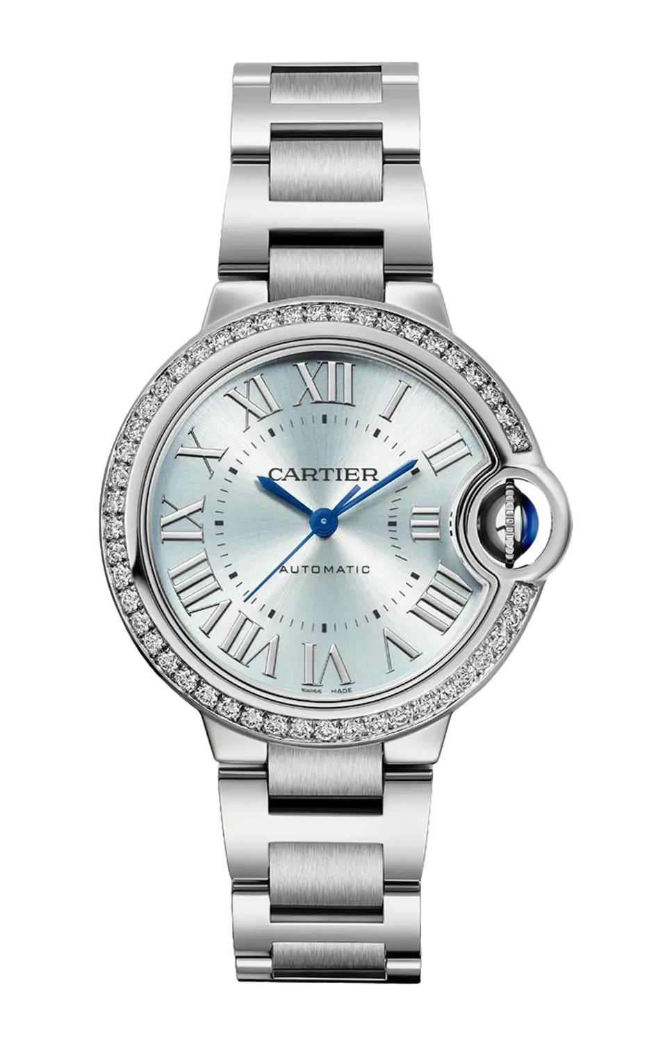 Часы Cartier с шариком синего цвета, диаметр 33 мм, механический механизм с автоподзаводом. Стальной корпус, рифленая заводная головка с синтетической шпинелью в форме кабошона, стальной безель с 50 бриллиантами классической огранки (0,58 карата), посеребренный циферблат с эффектом солнечных лучей, стрелки в форме мечей из вороненой стали, сапфировое стекло, сменный браслет из стали. Толщина 10,16 мм. Водонепроницаемость до 30 метров.