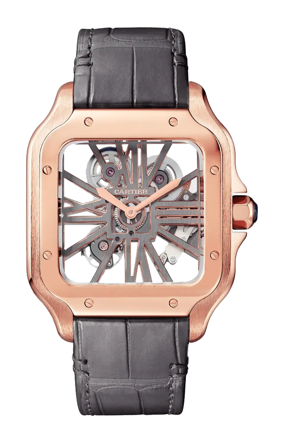 Бренд: Cartier Часы-скелетон Santos, крупная модель, мануфактурный механизм с ручным заводом, калибр 9619 MC. Корпус из розового золота 750/1000 пробы, семиугольная заводная головка из розового золота 750/1000 пробы с ограненным сапфиром, позолоченные стрелки в форме мечей, сапфировое стекло и задняя крышка. Два ремешка, один из кожи аллигатора, другой из телячьей кожи, оснащены системой быстрой замены и сменной пряжкой из розового золота 750/1000 пробы. Часы, минуты со скелетонизированными мостами в форме римских цифр. Механизм с индивидуальной нумерацией, 138 деталей и 20 камней. Размеры: 28 х 28 мм, толщина 3,97 мм, балансовое колесо: 28 800 полуколебаний/час, запас хода около 72 часов. Ширина корпуса 39,7 мм, толщина: 9,08 мм. Водонепроницаемость до 100 метров.