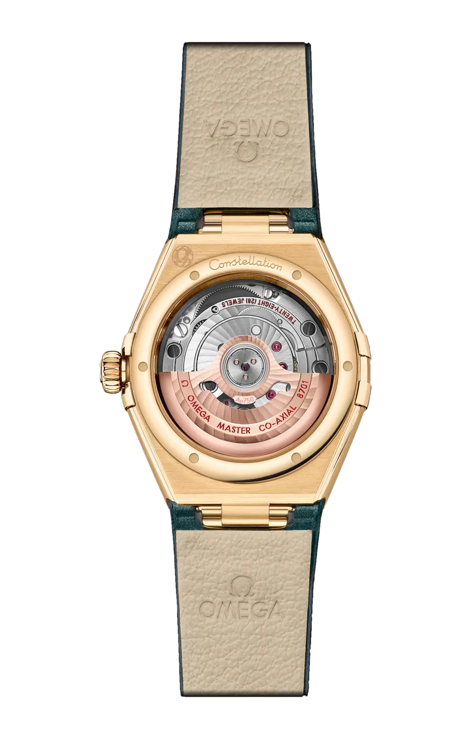 Бренд: Omega Необычный дизайн коллекции Omega Constellation, рассчитанный на долгие годы, характеризуется знаменитыми серповидными гранями и «зубцами» на корпусе. Эта модель диаметром 29 мм из 18-каратного желтого золота оснащена безелем с выгравированными римскими цифрами и циферблатом цвета шампанского. с матовой отделкой в виде солнечных лучей, бриллиантовыми часовыми метками и окошком даты в положении «6 часов». Стрелки, логотип Omega, звезда созвездия и ромбовидные оправы также присутствуют. из 18-каратного желтого золота. Легендарный браслет «моно-кольцо» заменен зеленым кожаным ремешком. Часы бьются в ритме коаксиального хронометра Omega Master Chronometer 8701, который виден сквозь устойчивое к царапинам куполообразное сапфировое стекло.