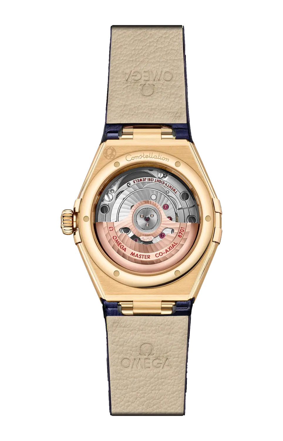 Бренд: Omega Необычный дизайн коллекции Omega Constellation, рассчитанный на долгие годы, характеризуется знаменитыми серповидными гранями и «зубцами» на корпусе. Эта модель диаметром 29 мм из желтого золота оснащена безелем с выгравированными римскими цифрами и циферблатом из авантюринового стекла. синего цвета с бриллиантовыми часовыми метками и окошком даты в положении «6 часов». Стрелки, логотип Omega, звезда созвездия и бриллиантовая оправа также выполнены из желтого золота. 18 карат. Легендарный браслет с монокольцом заменен синим кожаным ремешком. Часы бьются в ритме коаксиального хронометра Omega Master Chronometer 8701, который виден сквозь устойчивое к царапинам куполообразное сапфировое стекло.