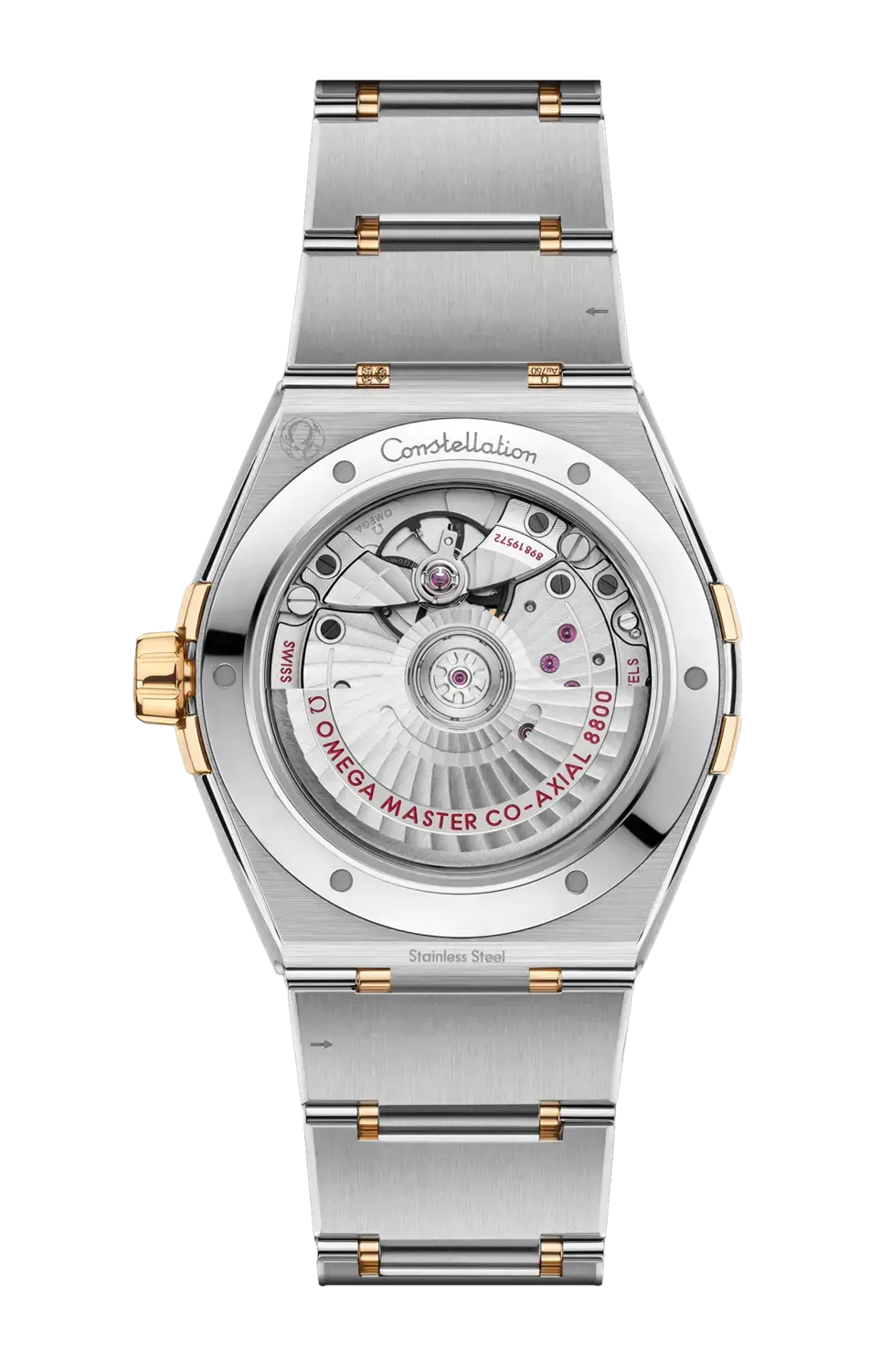 Бренд: Omega Необычный дизайн коллекции Omega Constellation, рассчитанный на долгие годы, характеризуется знаменитыми полумесяцами, «зубцами» на корпусе и браслетами с одним кольцом. Эта модель диаметром 39 мм из нержавеющей стали и желтого золота 18 карат оснащена безелем, усыпанным бриллиантами, серебряным опаловым циферблатом с бриллиантовыми часовыми метками, окошком даты в положении «6 часов», логотипом Omega, звездой созвездия и креплениями часов. Все бриллианты на циферблате выполнены из 18-каратного желтого золота. Часы бьются в ритме коаксиального хронометра Omega Master Chronometer 8800, который виден сквозь устойчивое к царапинам куполообразное сапфировое стекло.
